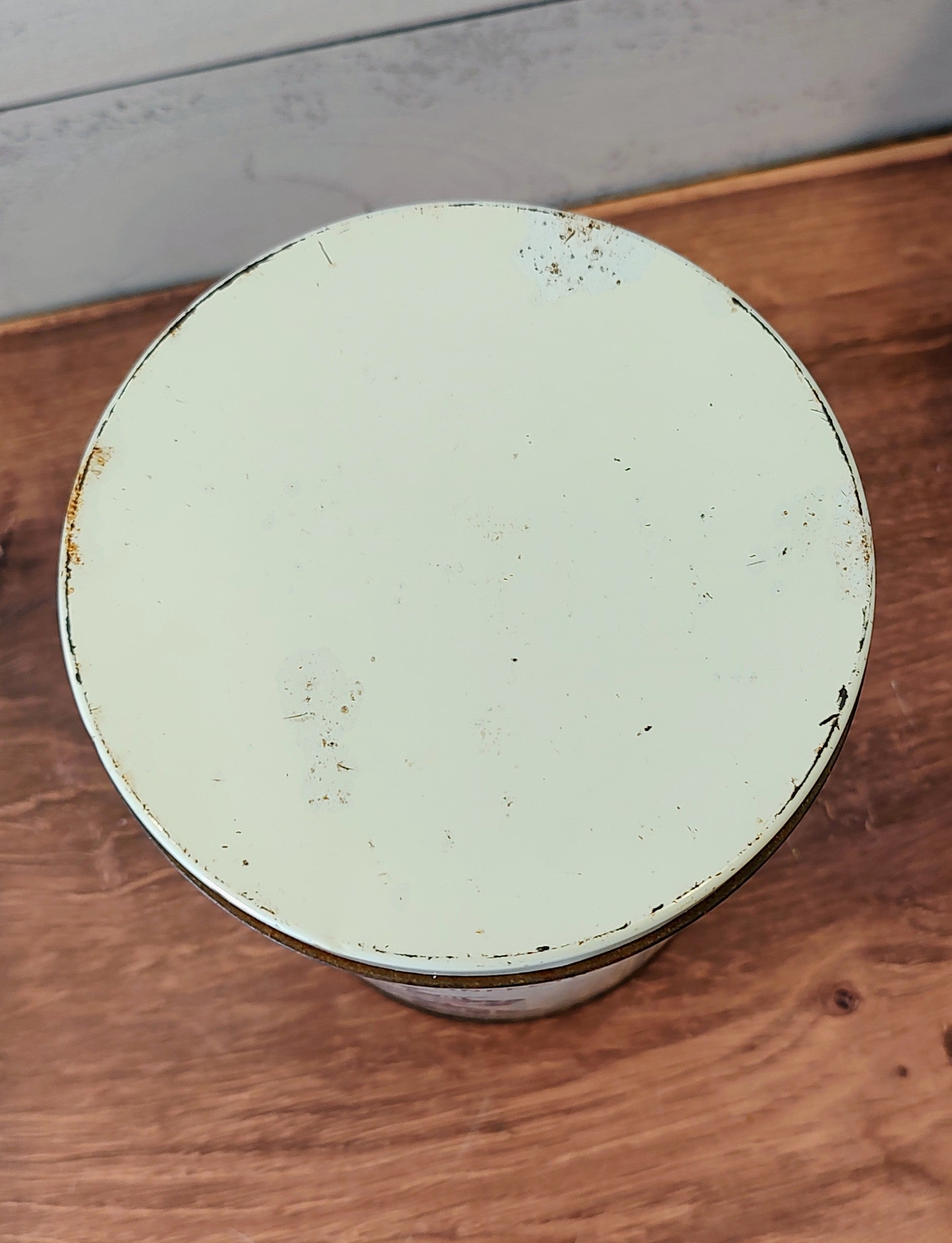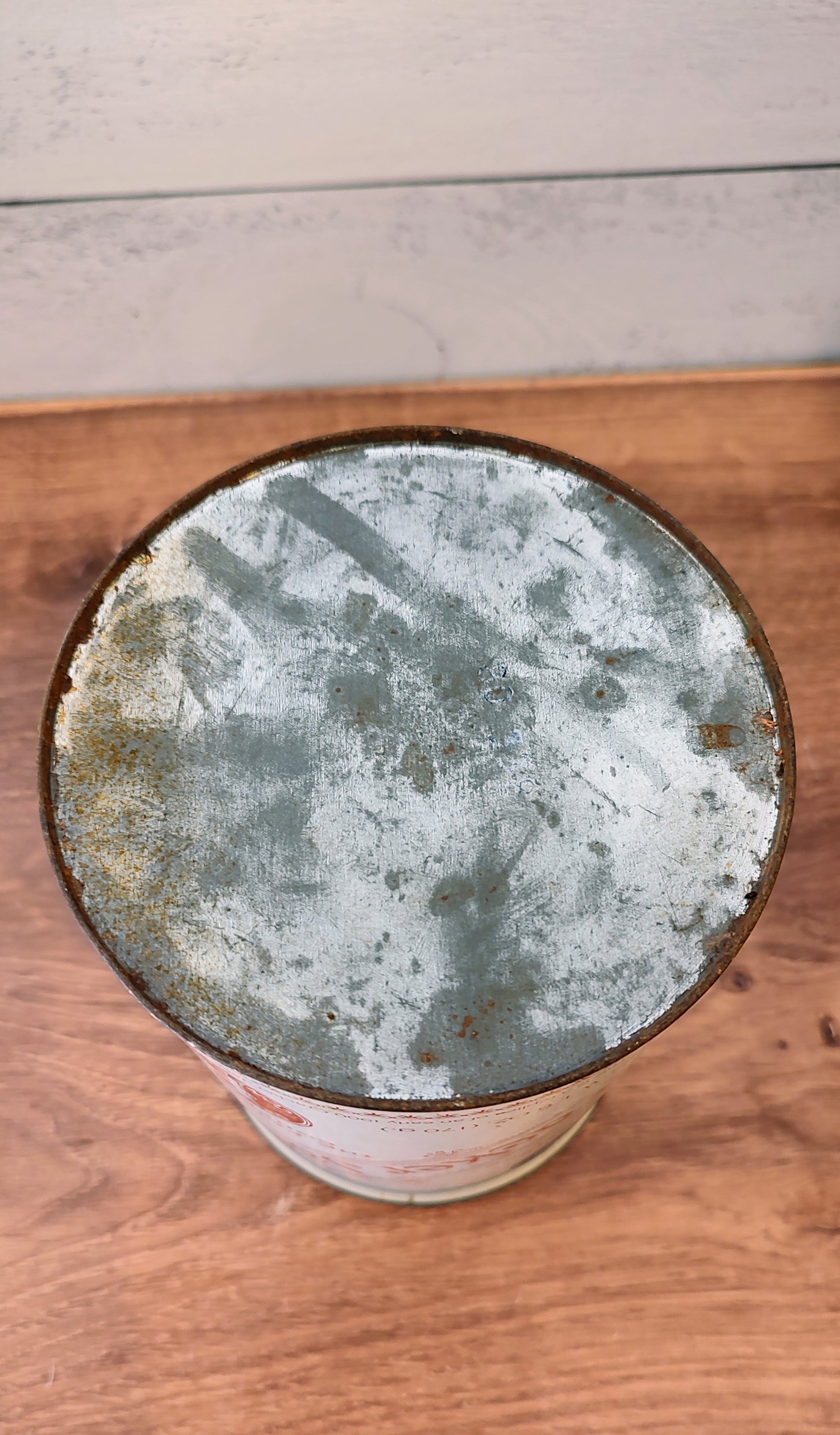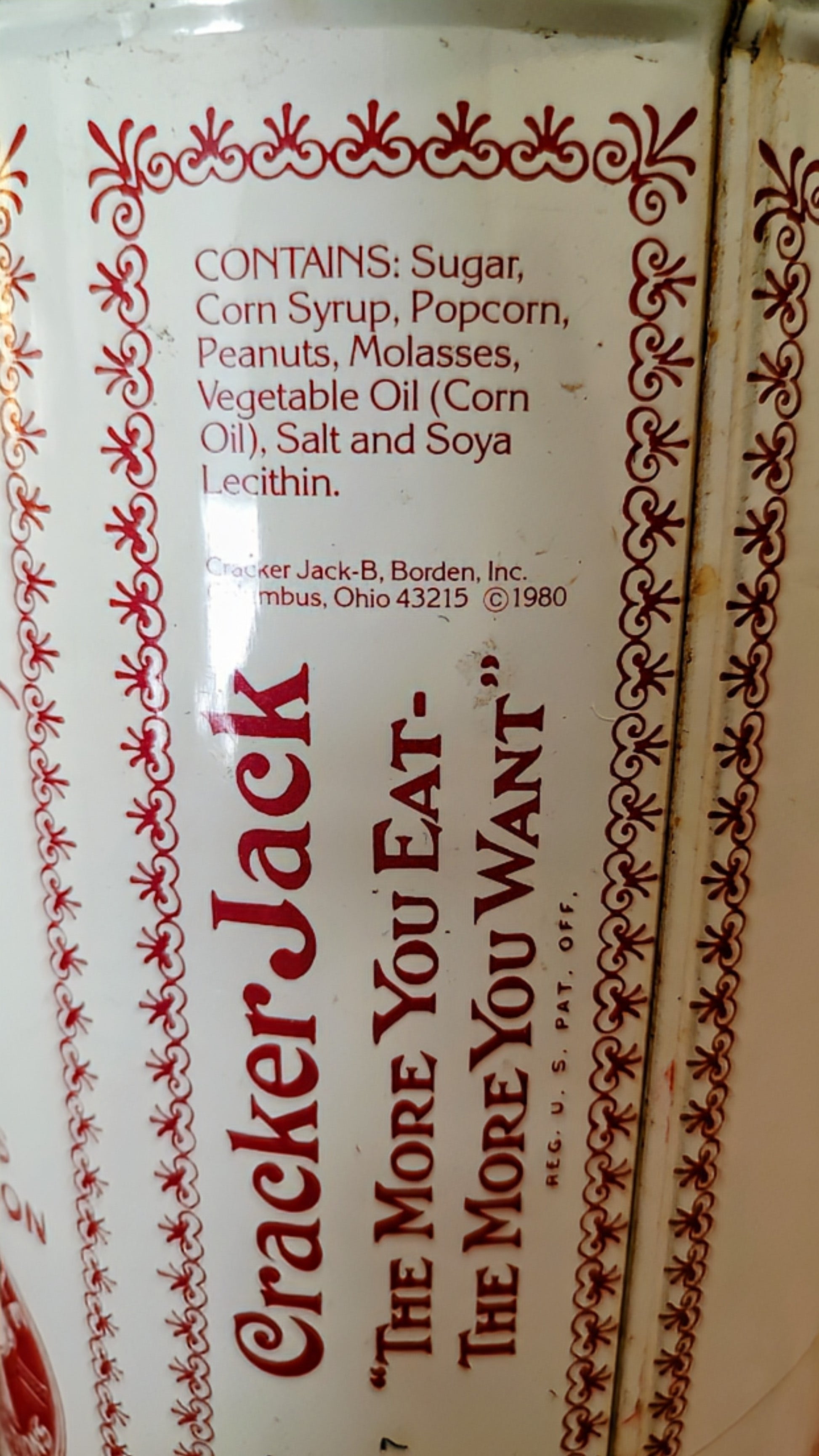 A vintage cracker jack tin stands at approximately 8 1/4" tall and is 5 1/4" wide. The one is rust Patina and wear given that it's 45 years old.