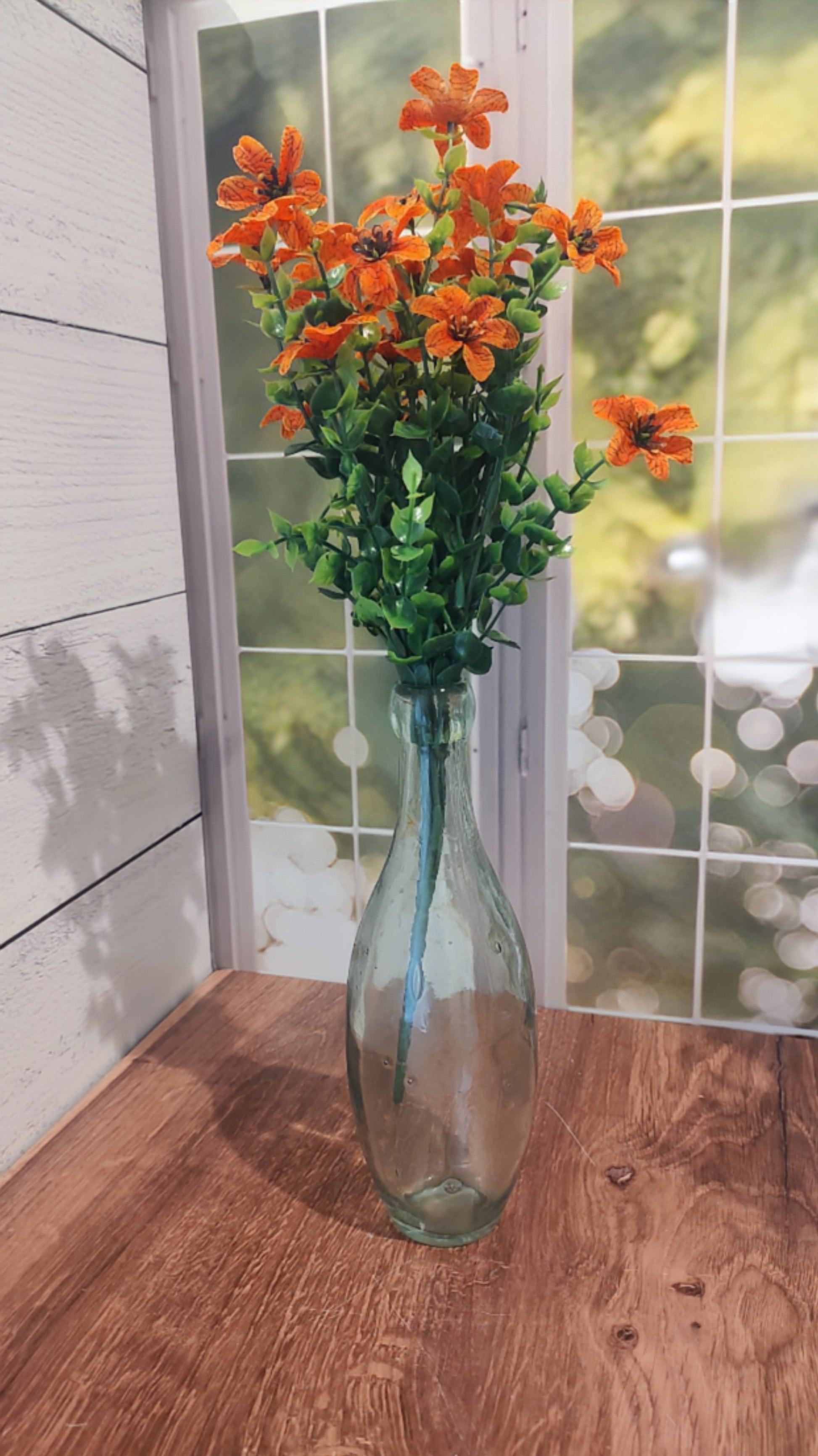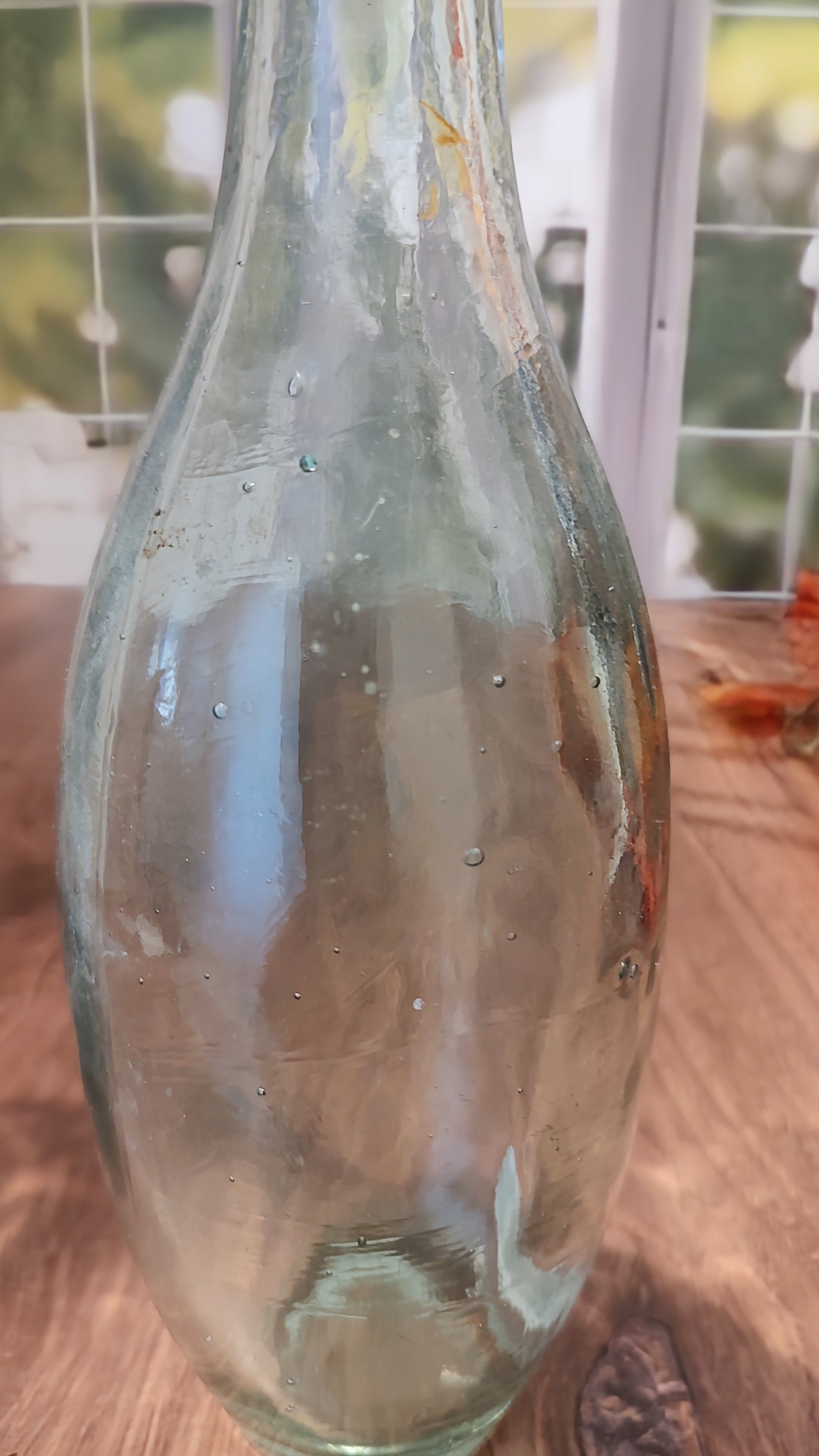 This antique beautiful green bottle meets any decor style or season with open arms! It can be displayed with flowers or as it's own centerpiece. Stands at about 8" tall.