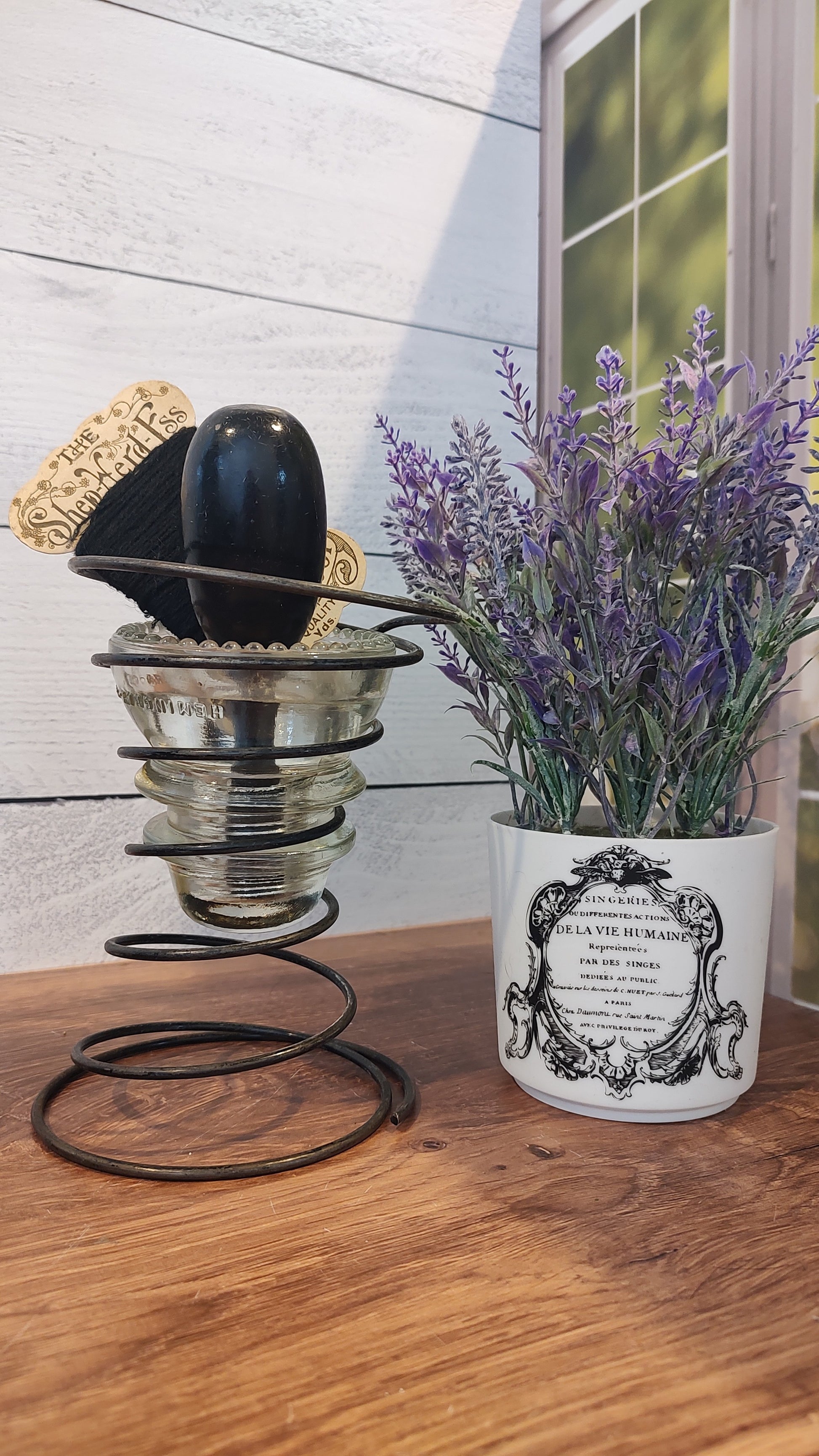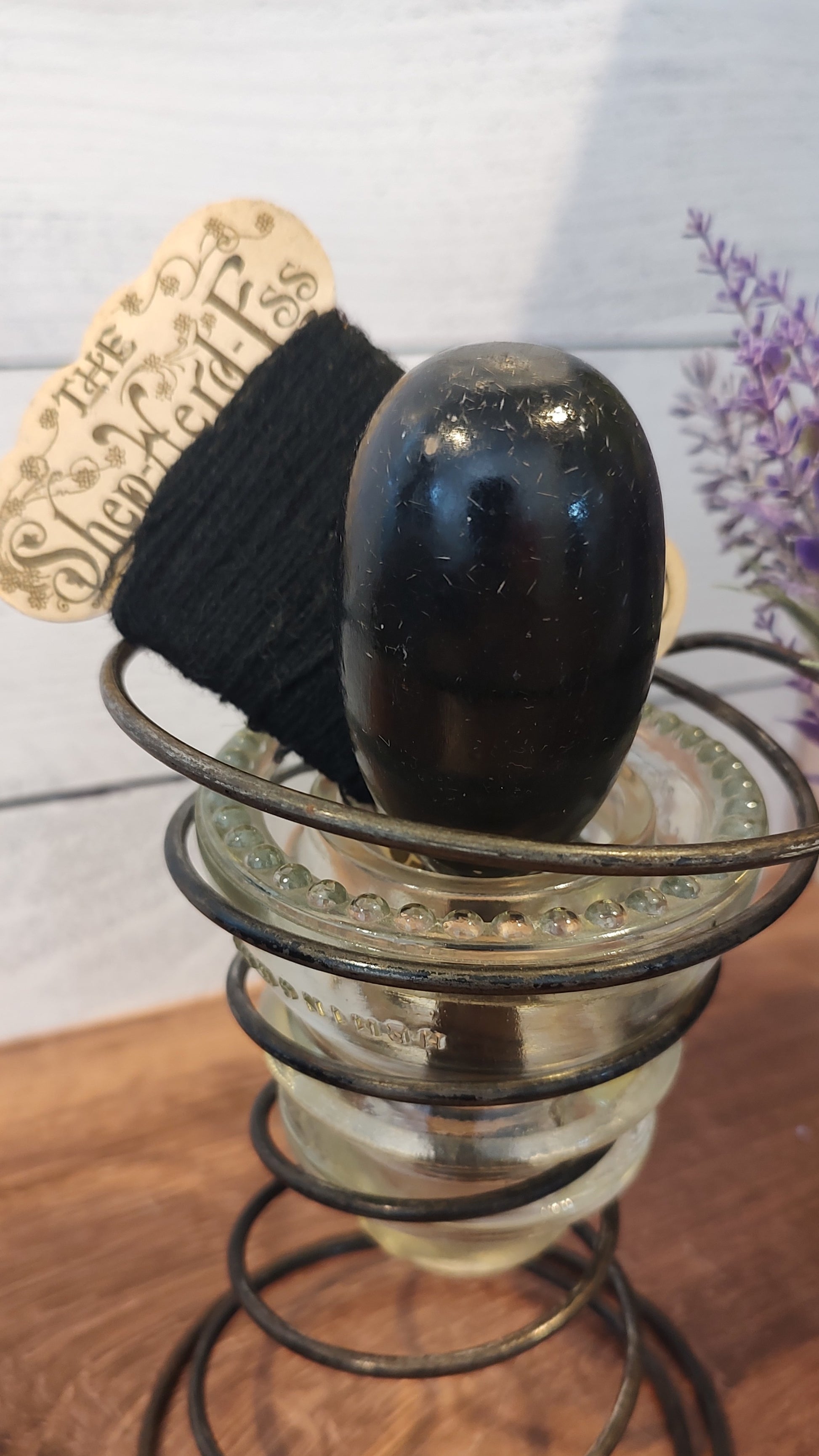 What a great addition to a display! This darning egg could be used still for socks, gloves, sweaters, you name it. But I love it displayed with this original thread for the perfect vintage sewing room.