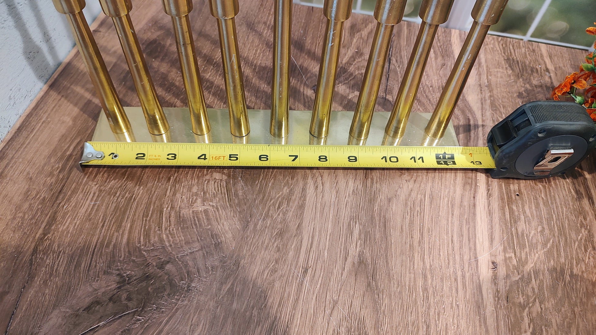 This brass colored Menorah holds skinny candles giving a beautiful holiday display.