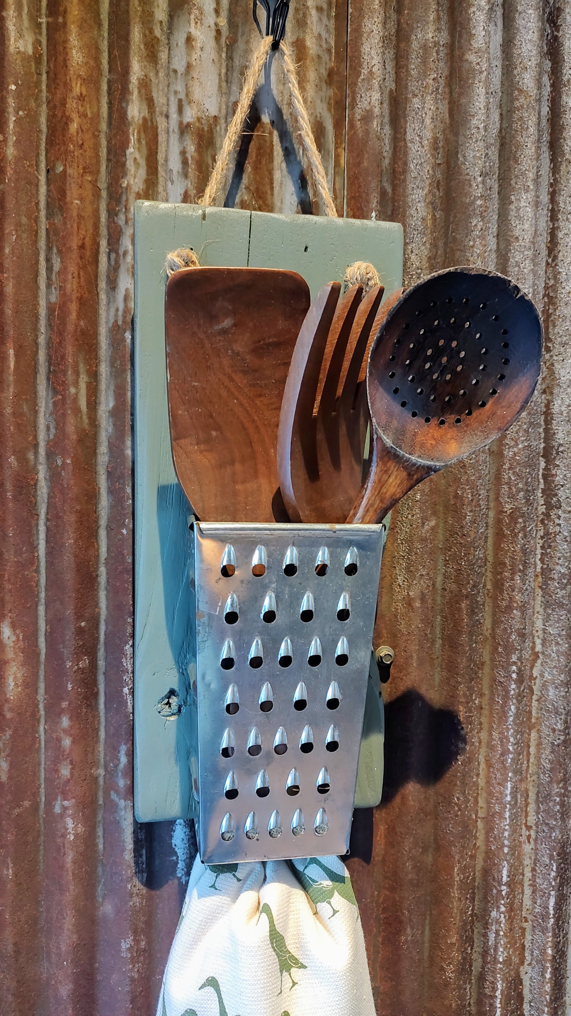 Repurposed barn wood and vintage grater make up this adorable, yet useful hanging that provides storage for things like your wooden spoons and the perfect spot for a towel to hang.