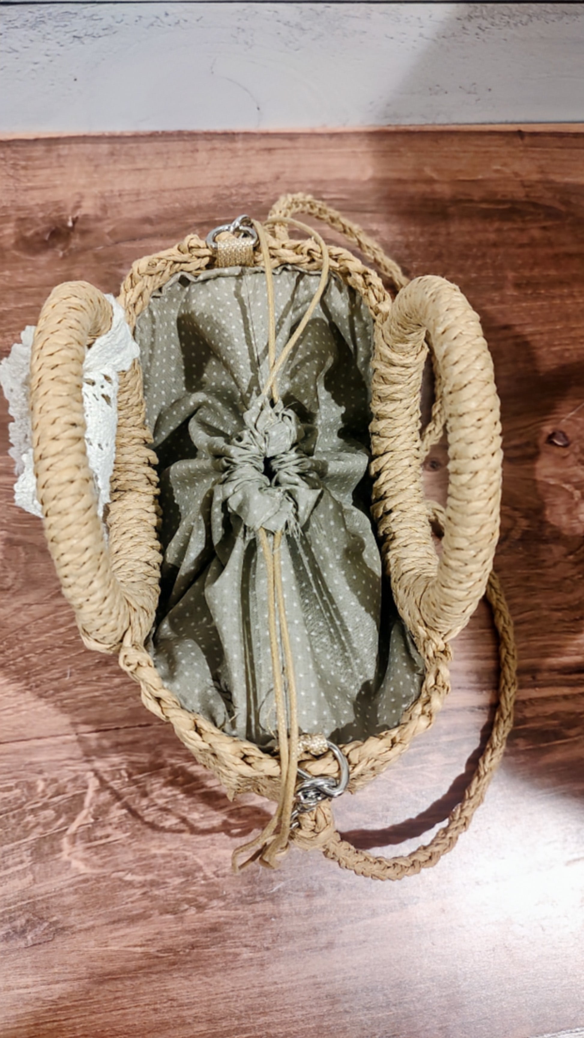 With a little chinch sack closure and pocket inside, this bag with shoulder strap can be carried as a purse or used as a piece of decor.