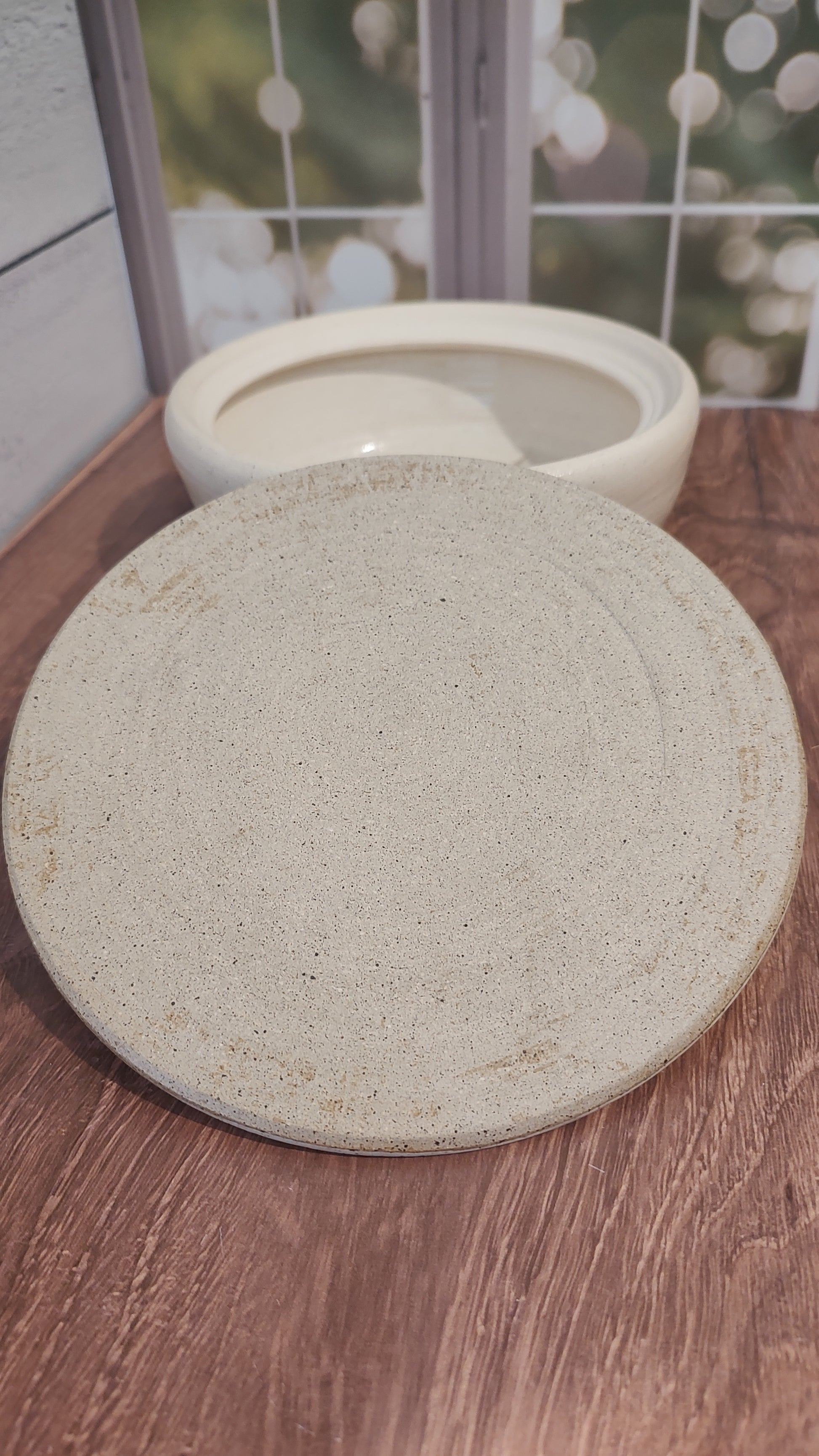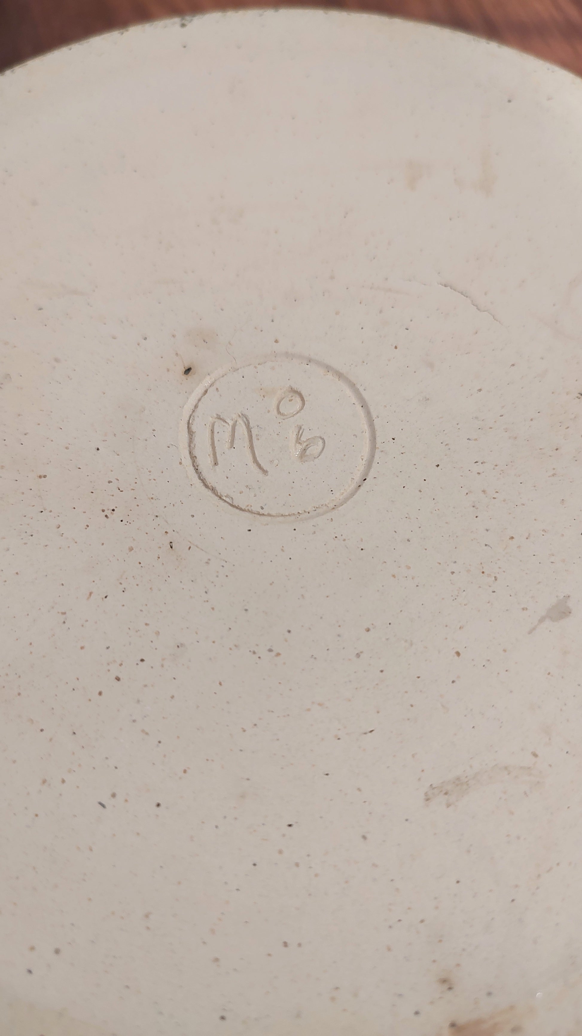 I just fell in love with this handmade, hand painted piece. While due to the variation in color and style, I'm not sure if they made to go together. I believe the dish has a lid based on the lip made at the top of the bowl, but this flat style lid may have had a different original dish.