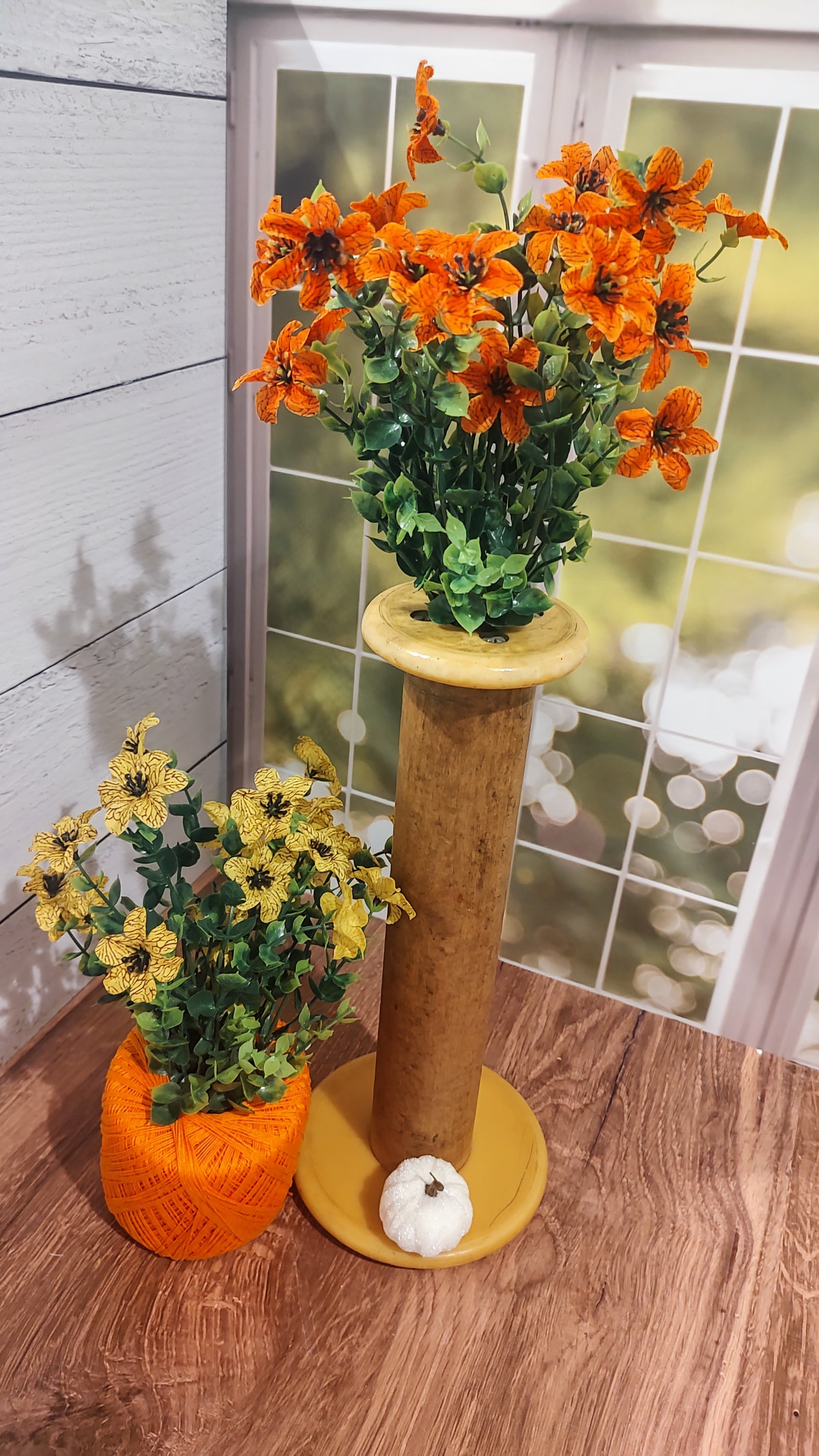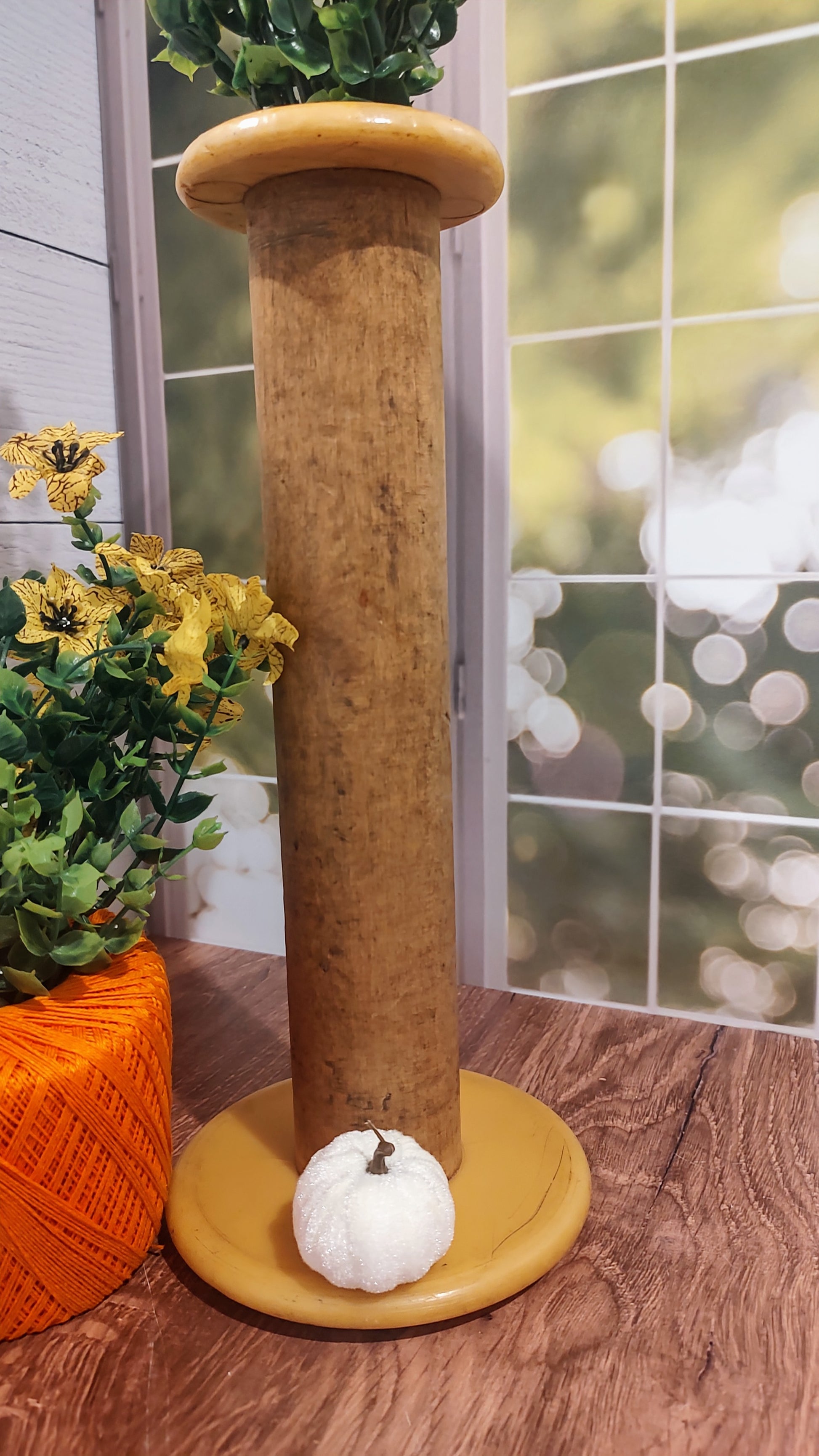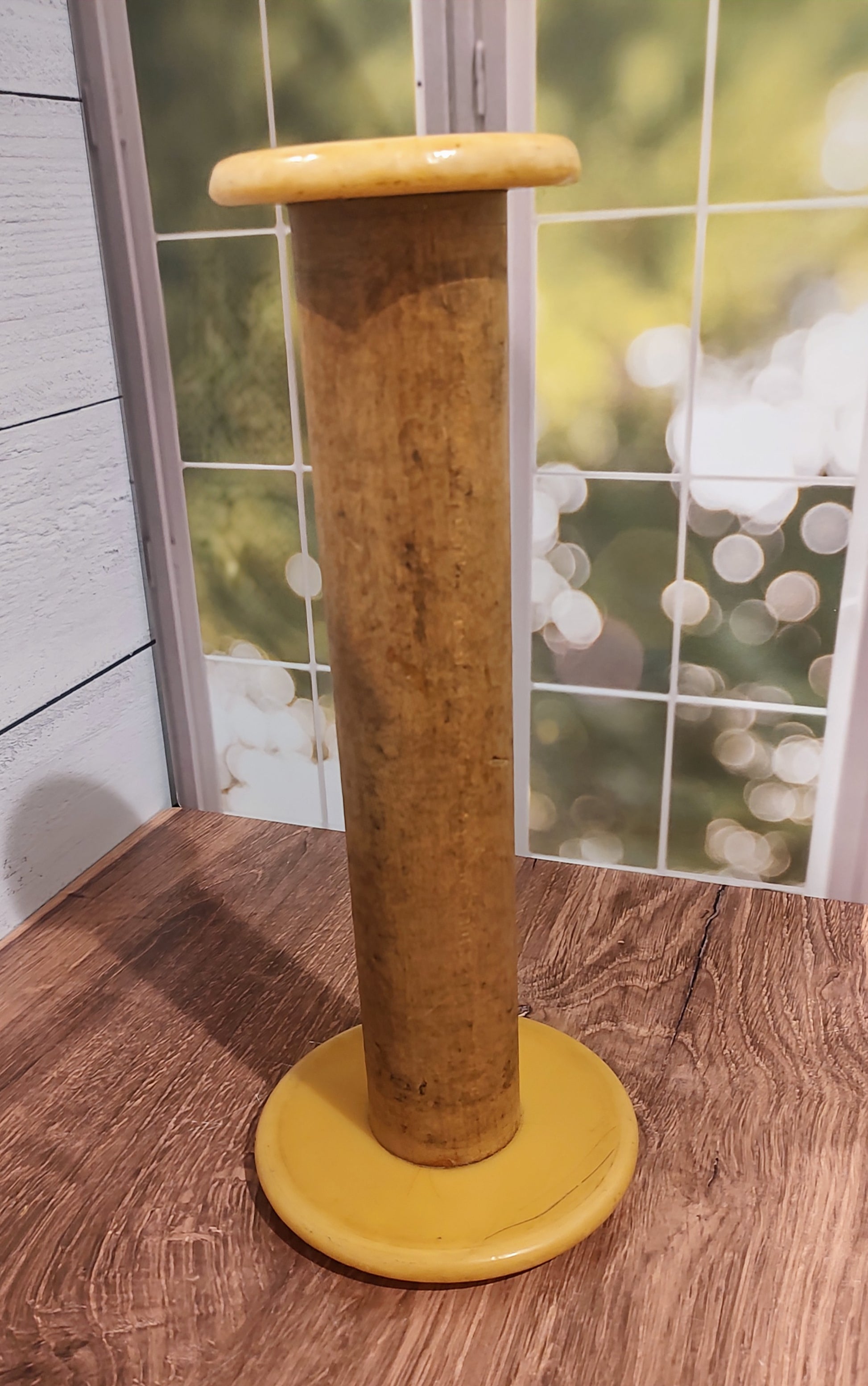 This large industrial spool is approximately 12.5" tall. It's made of wood with heavy "plastic" on the ends. It's great as is or upcycled into a unique towel rack, vase, or anything your imagination can drum up.