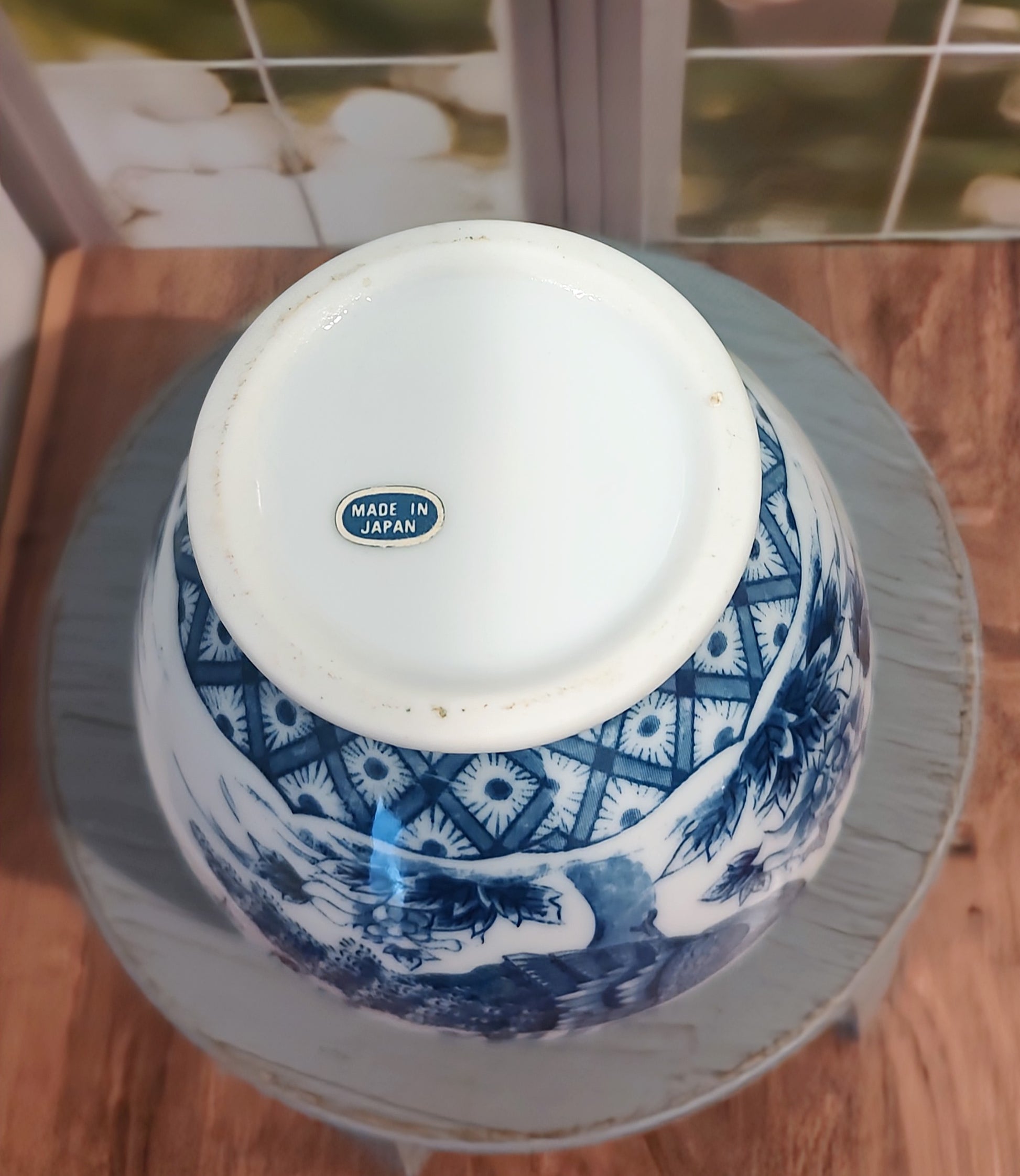 Beautiful blue and white jar adorning a peacock on each side. This vintage transferware jar is still wearing it's "Made in Japan" sticker on the bottom. The lid has matching colors with a floral pattern.