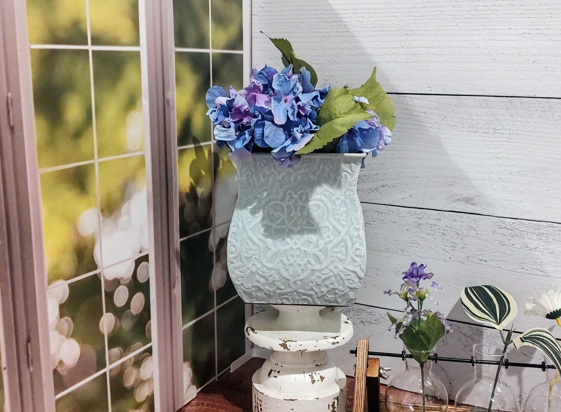 Metal planter painted blue with white overcoat. Comes with blue hydrangea floral.