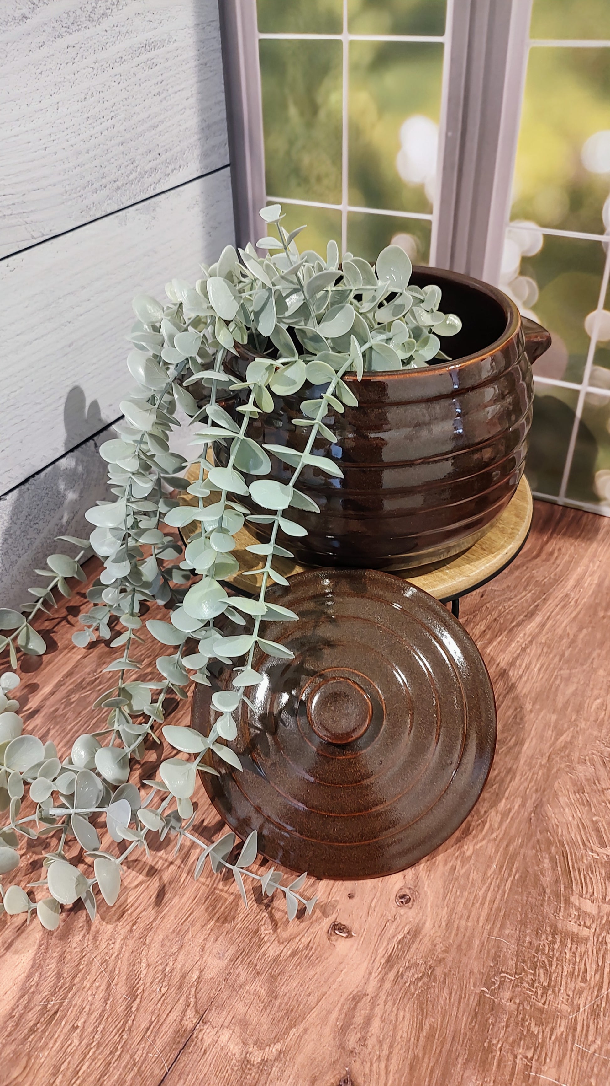 Vintage pottery from Monmouth, IL. This classic brown pot with its original lid can be used for cooking in the oven, serving hot or cold foods like beans, soup, fresh honey, cheese or cream... Or it can be a part of your traditional decor, paired with plants or flowers.