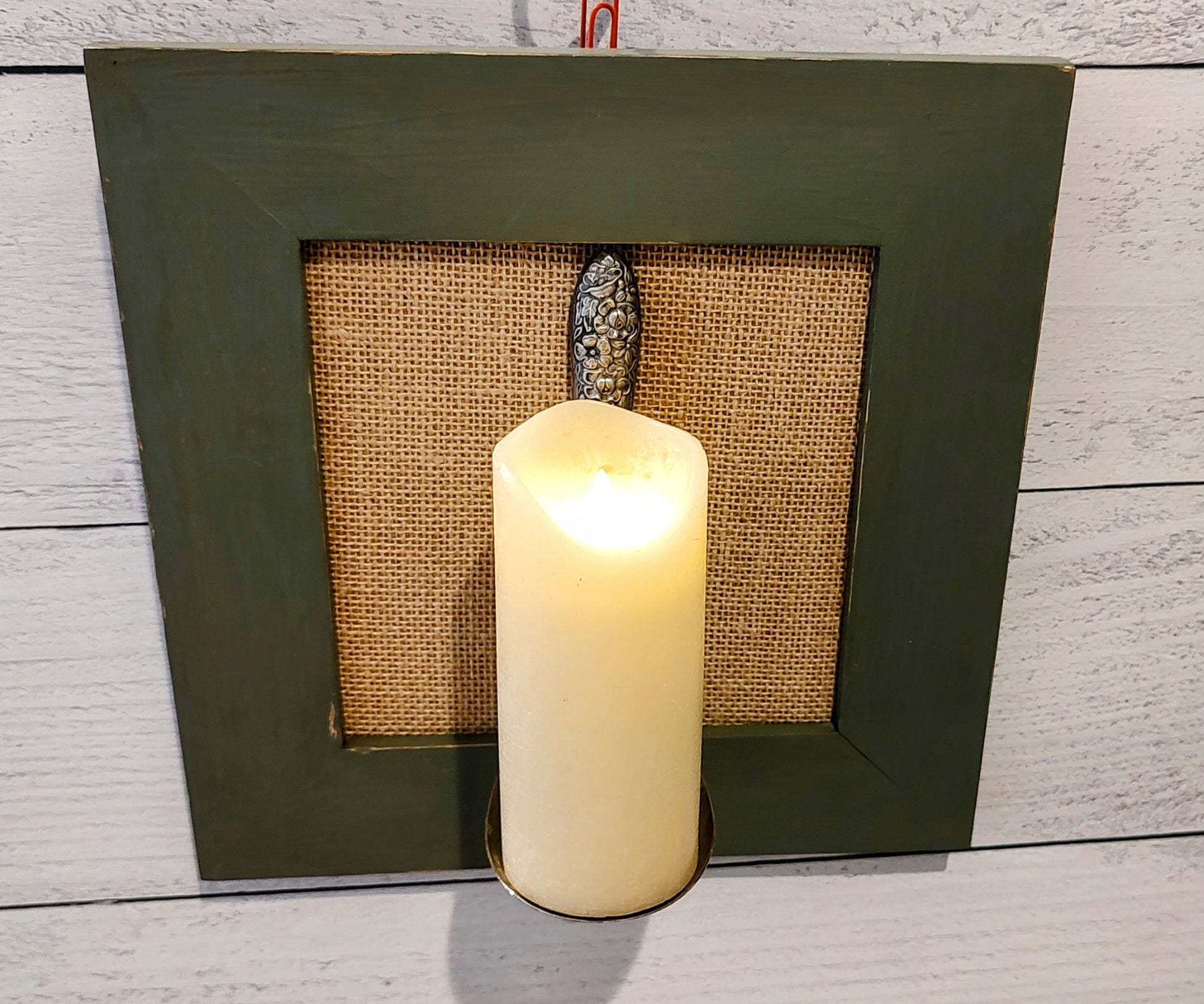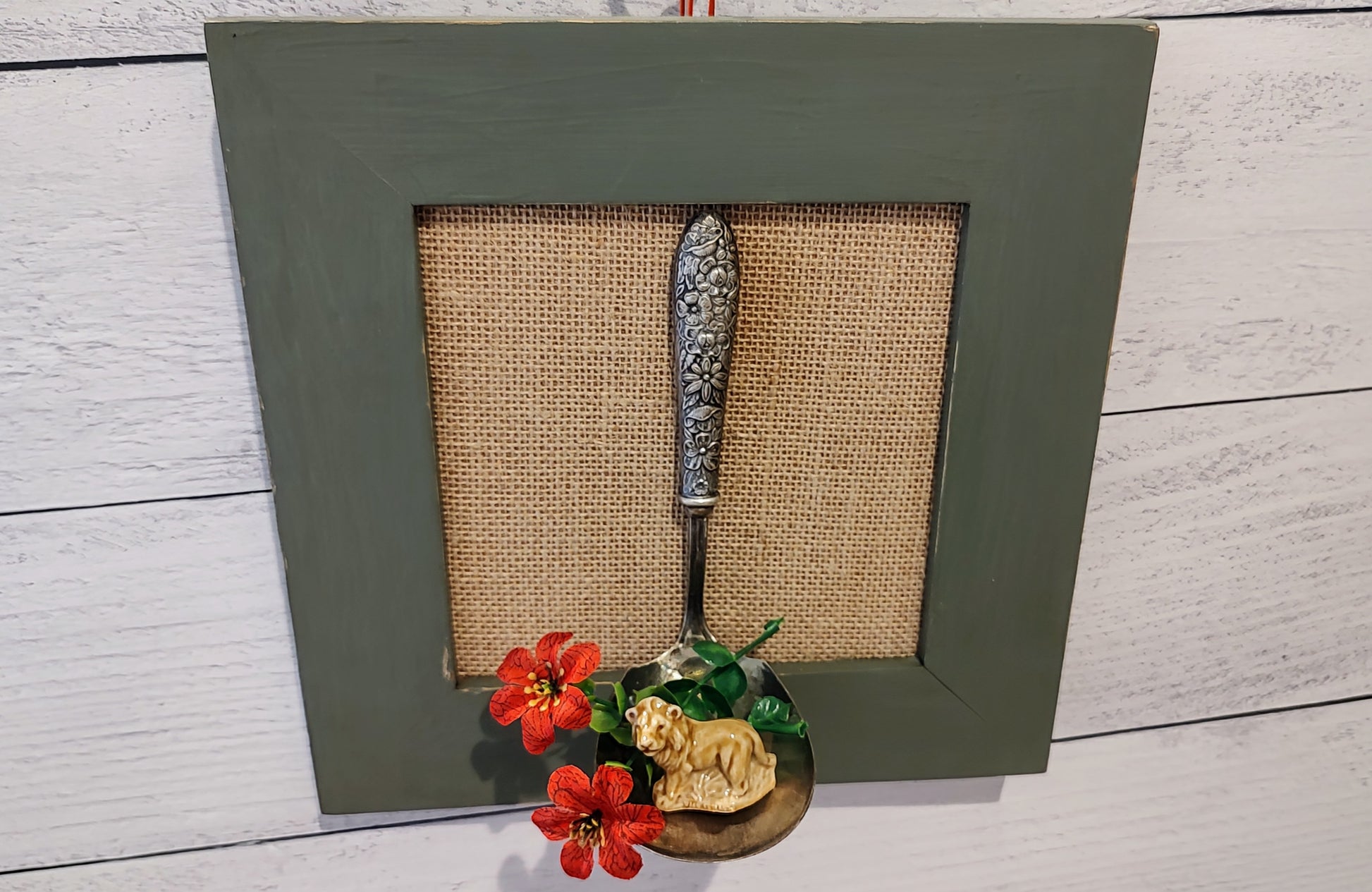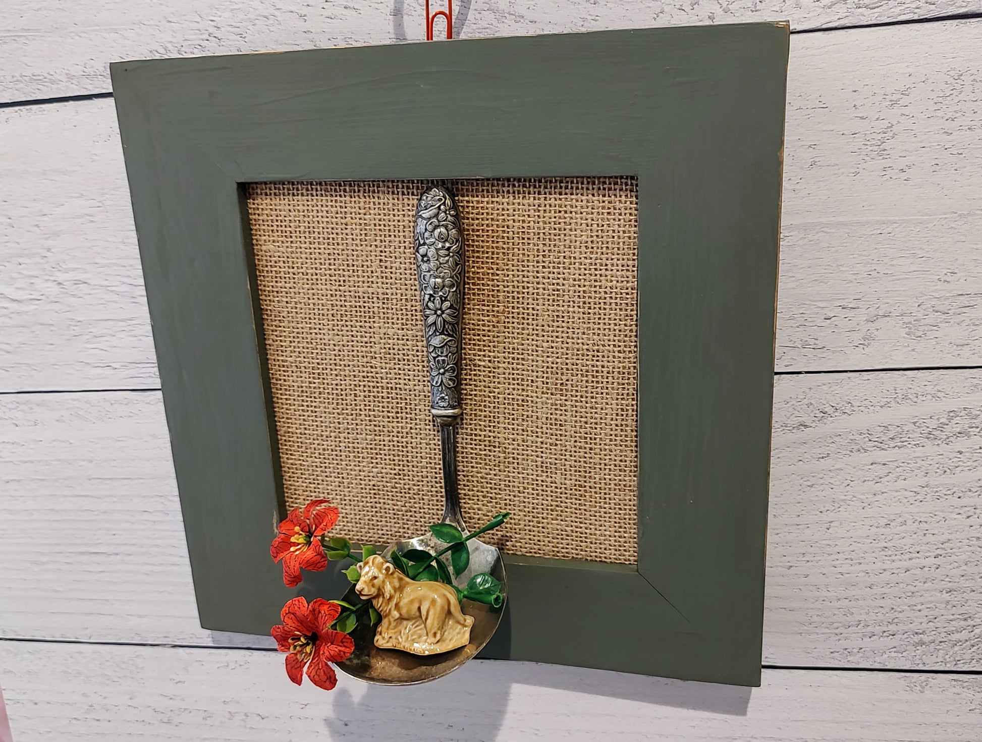 This painted picture frame with burlap houses an antique silver plated ladle making it perfect for holding a battery candle, small vase, flowers, knick knacks, etc.