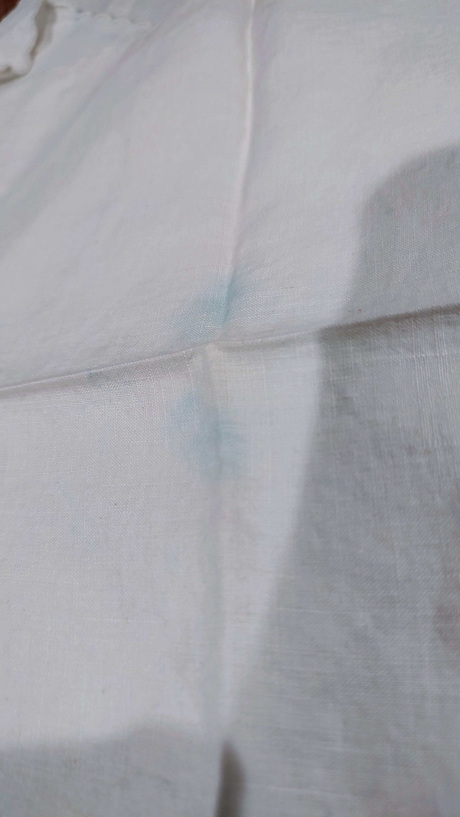 There are a couple with a hint of blue as though maybe they were washed with an item that faded. I did not attempt to wash them. Please see pictures.
