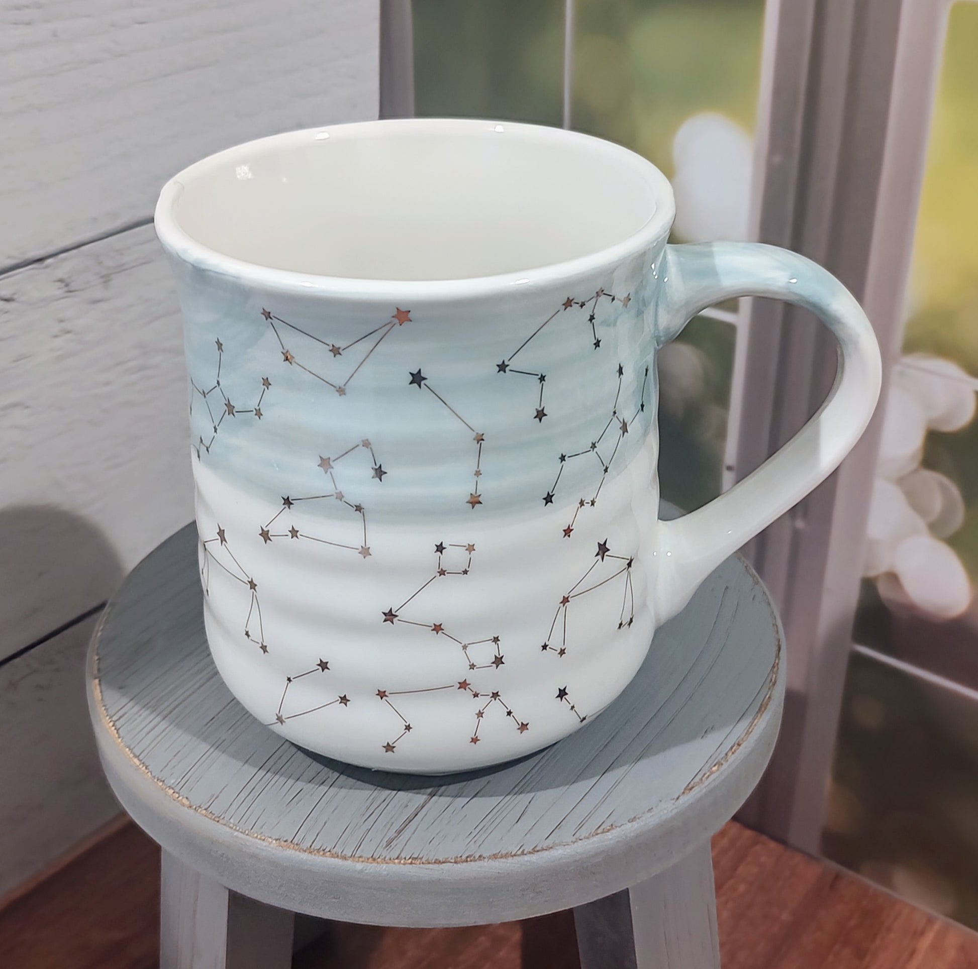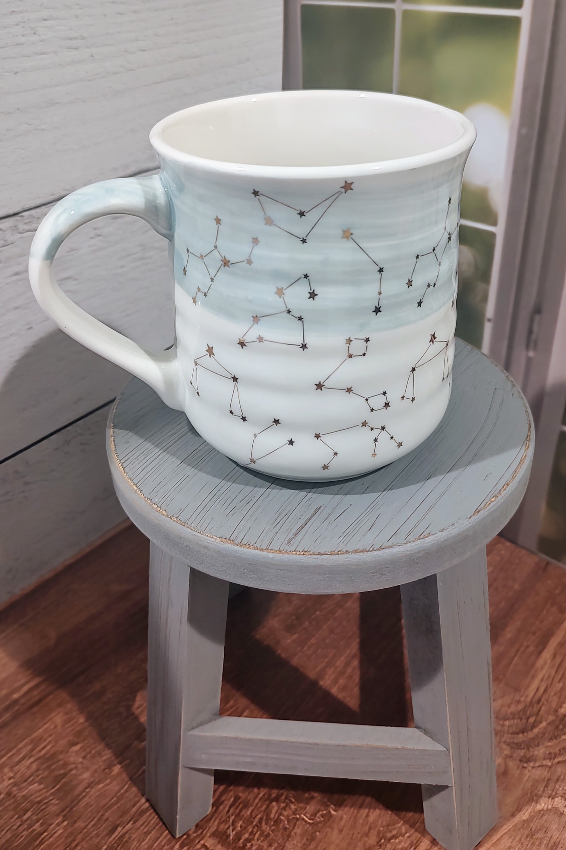Soft green blue and off white ribbed mug with constellations. Maker is Stay Wild Moon Child, designed in the USA.