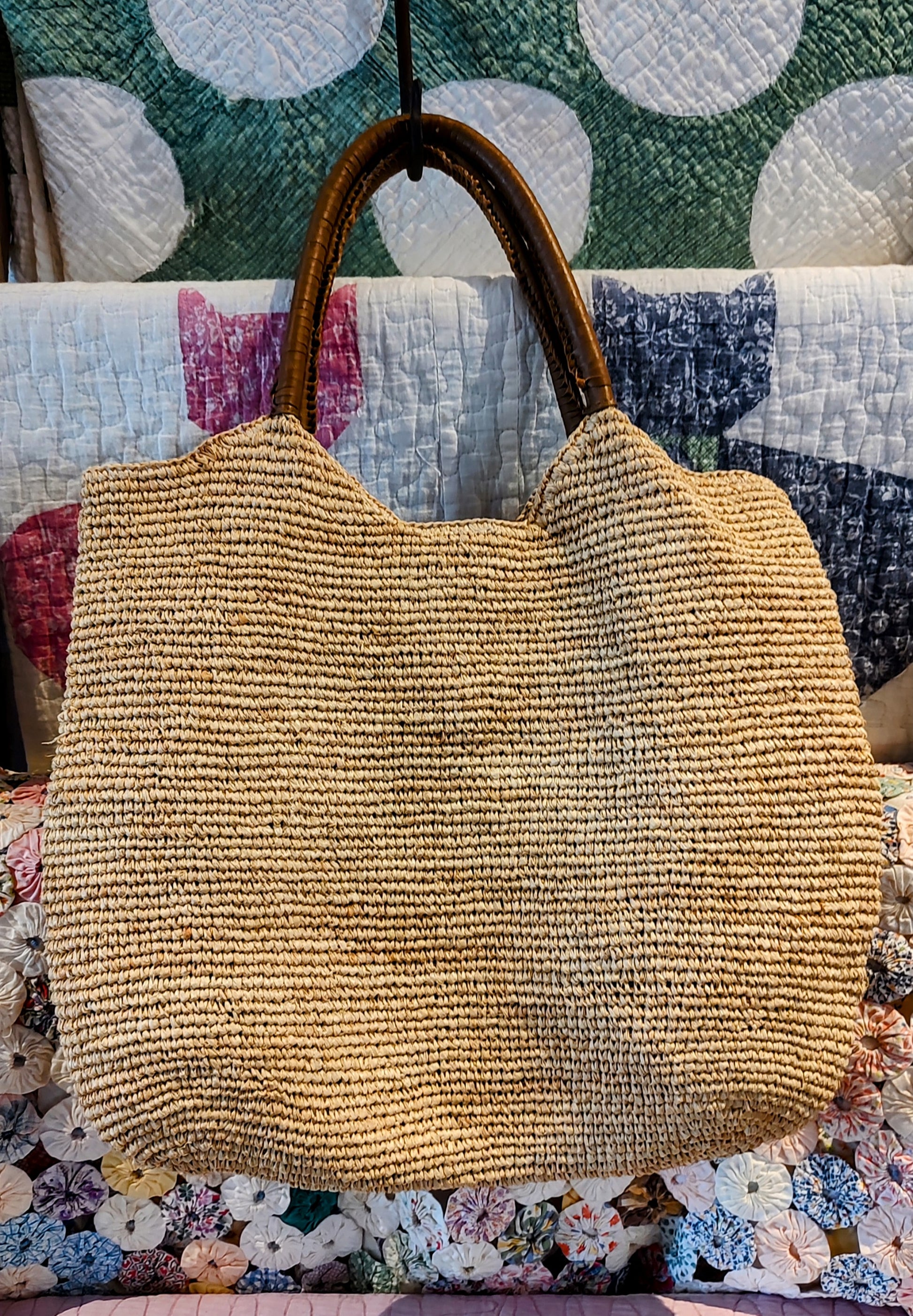 Made by Straw Studio, the bag is approximately 17" wide and 14" tall (not including the handle). There is about an 8" drop for the handle for a total height of 22" (lying flat).