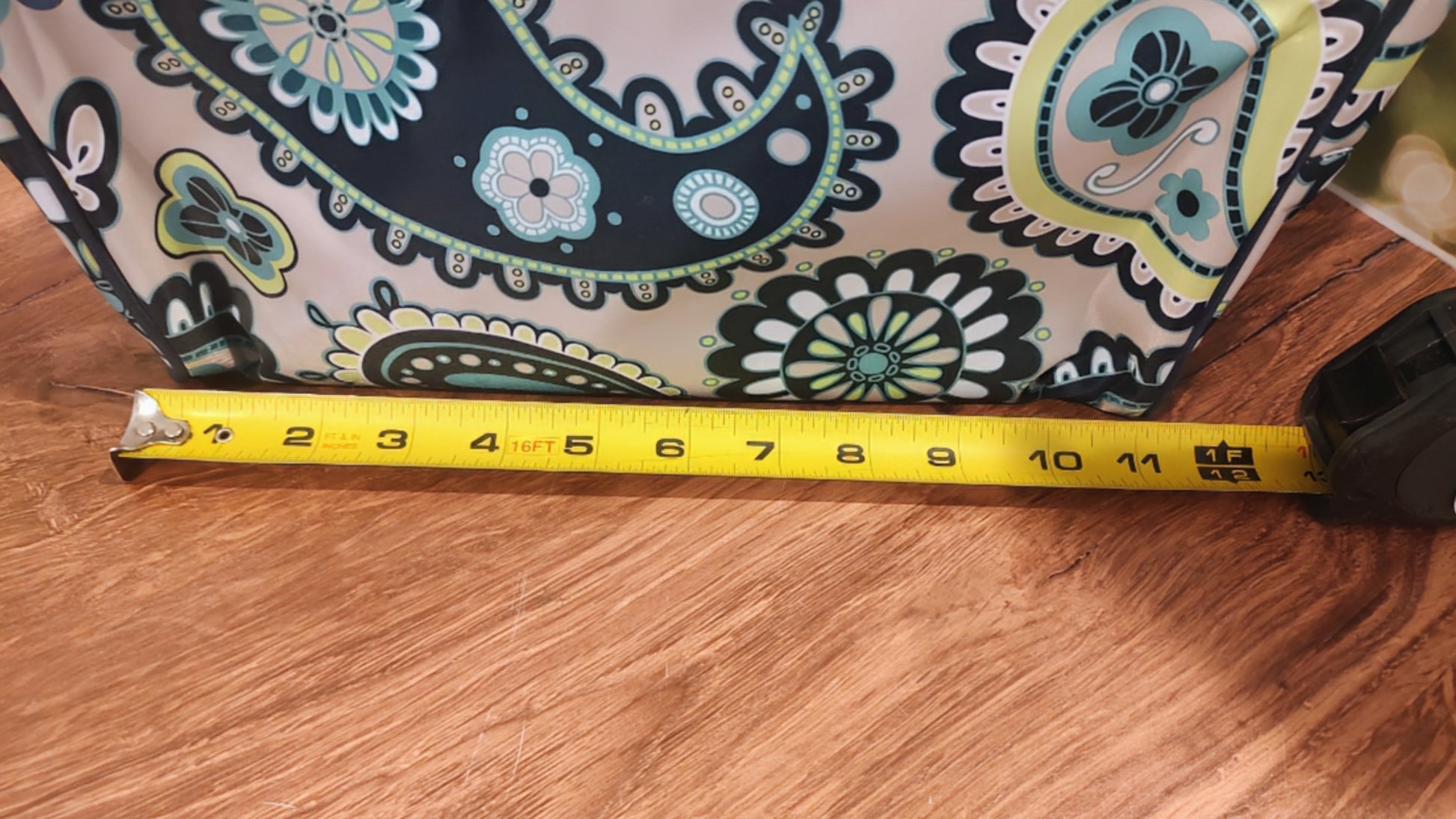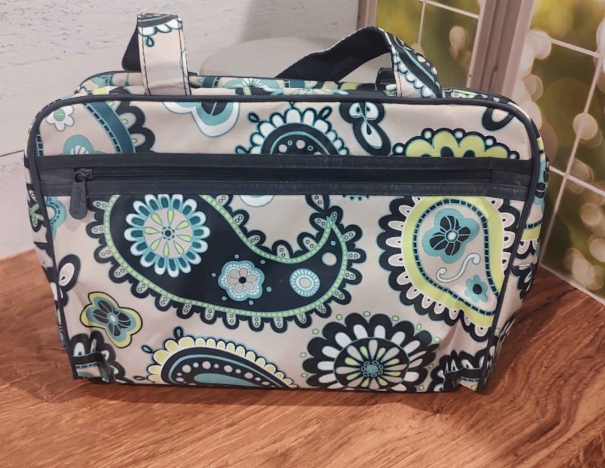 Gently used makeup bag has a zipper pocket on the outside, a lined inside with a pocket and elastic holders on one side.