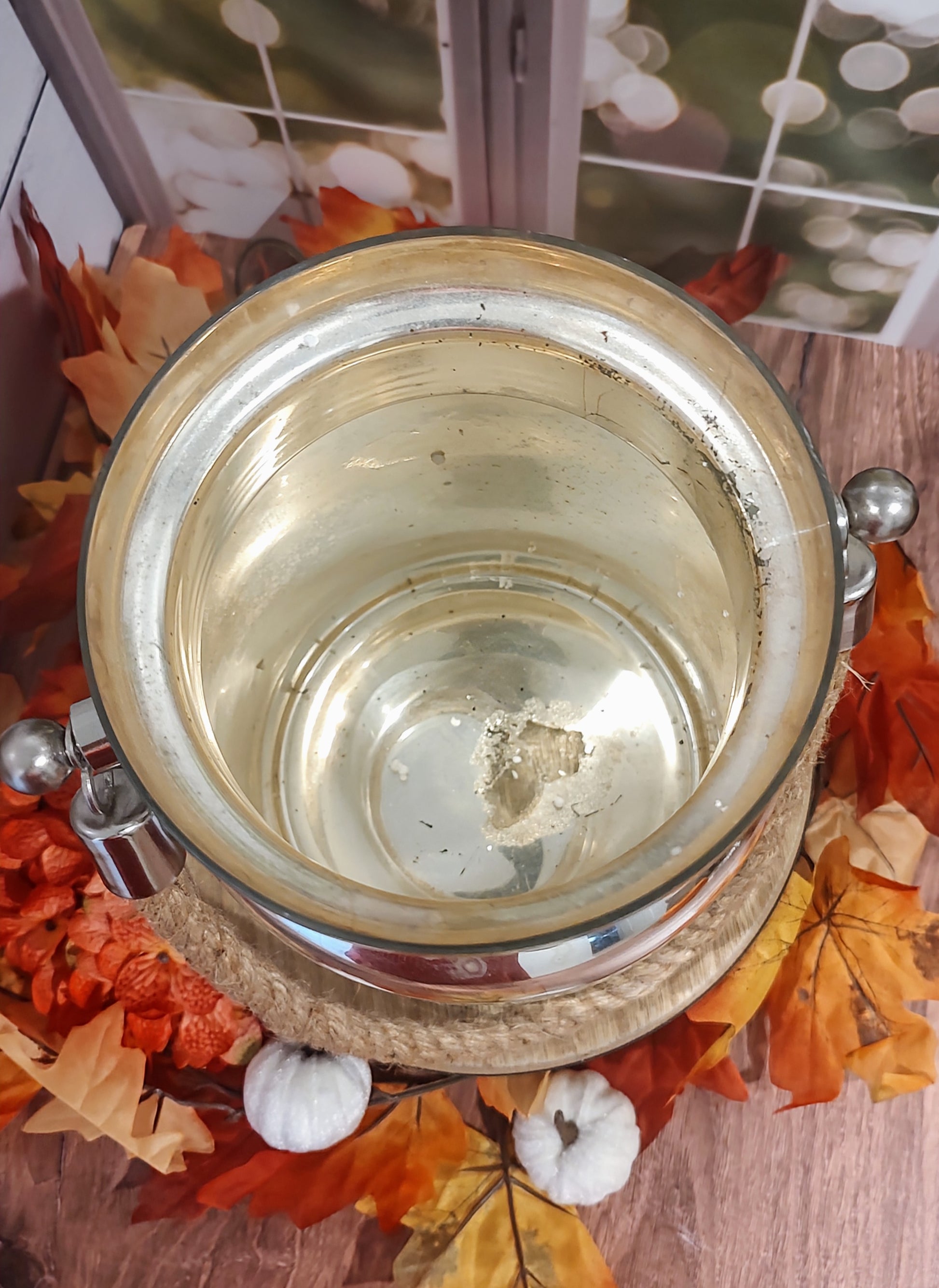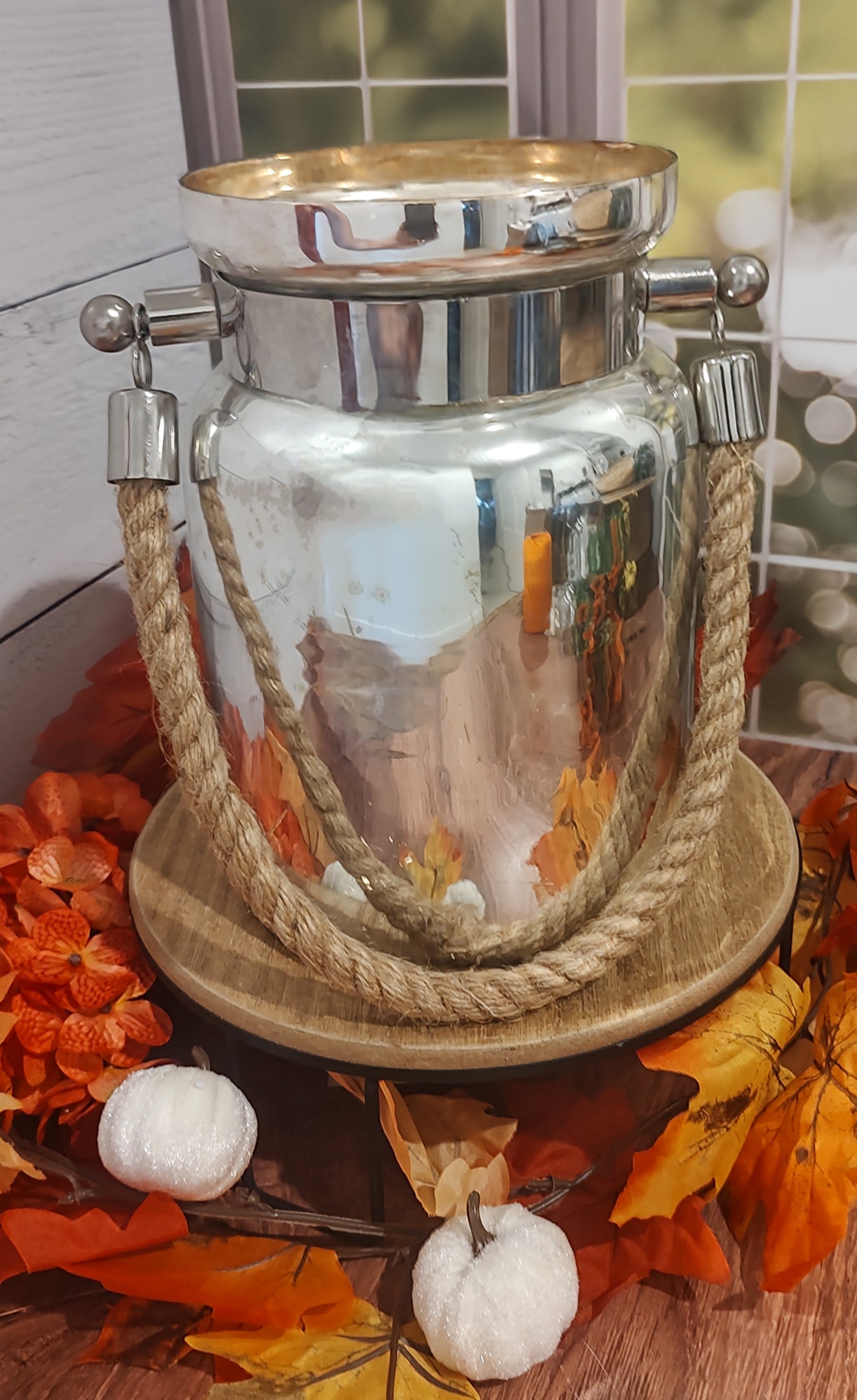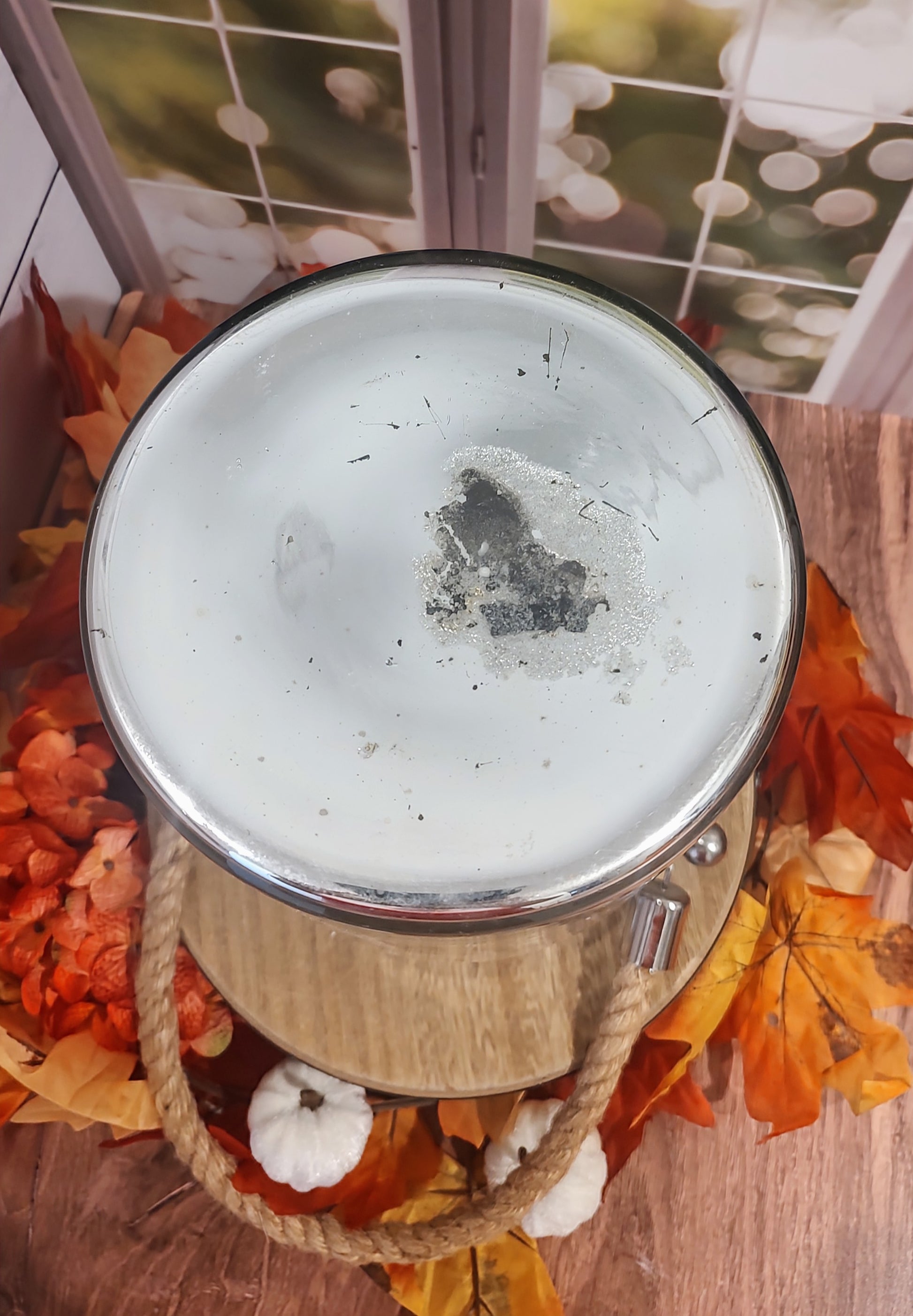 This large glass bucket has the perfect old style mirror effect for a wonderful Mercury Glass style vase. Change out the decor for each season and use it all year round!