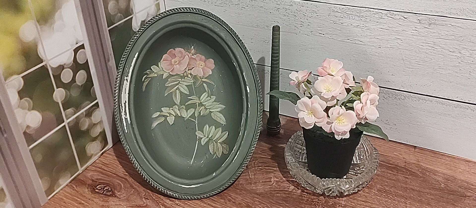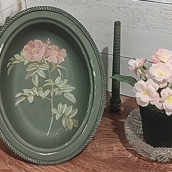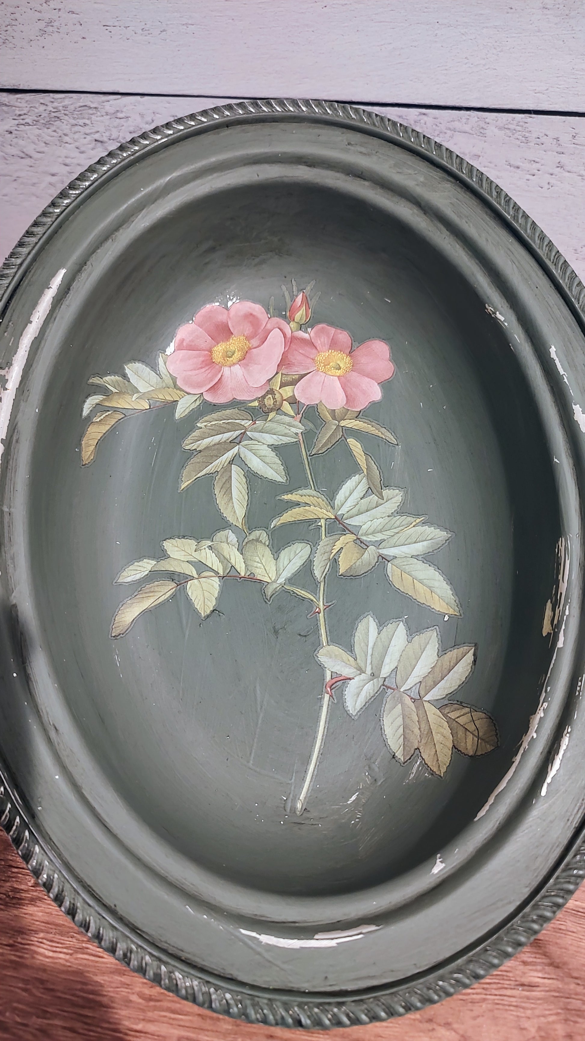 Poole Silver Co. silver bowl that has been repainted and an Iron Orchid Design floral transfer added. Has a self adhesive hook on the back for wall hanging. Can just be removed to be used as a flat bowl.