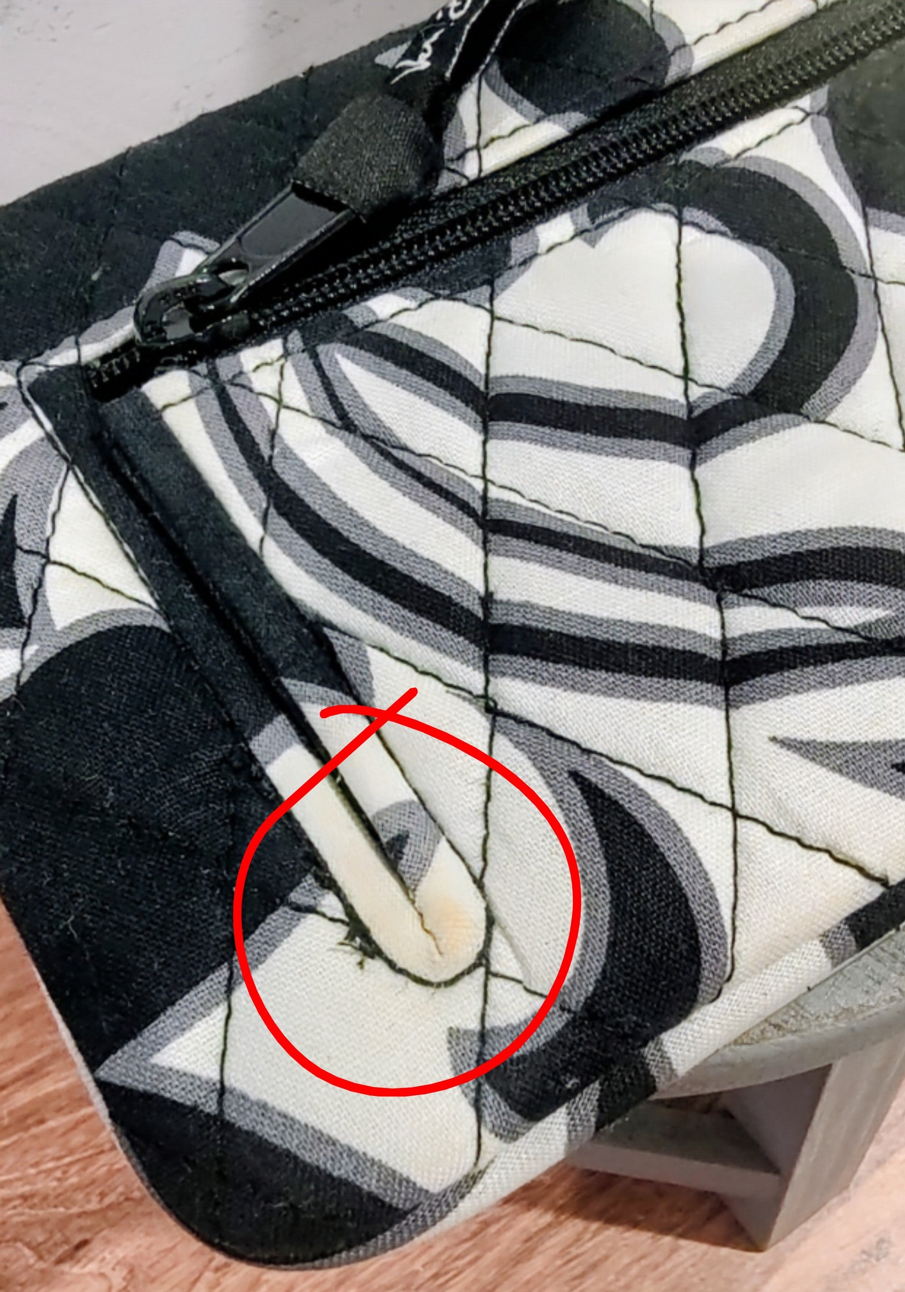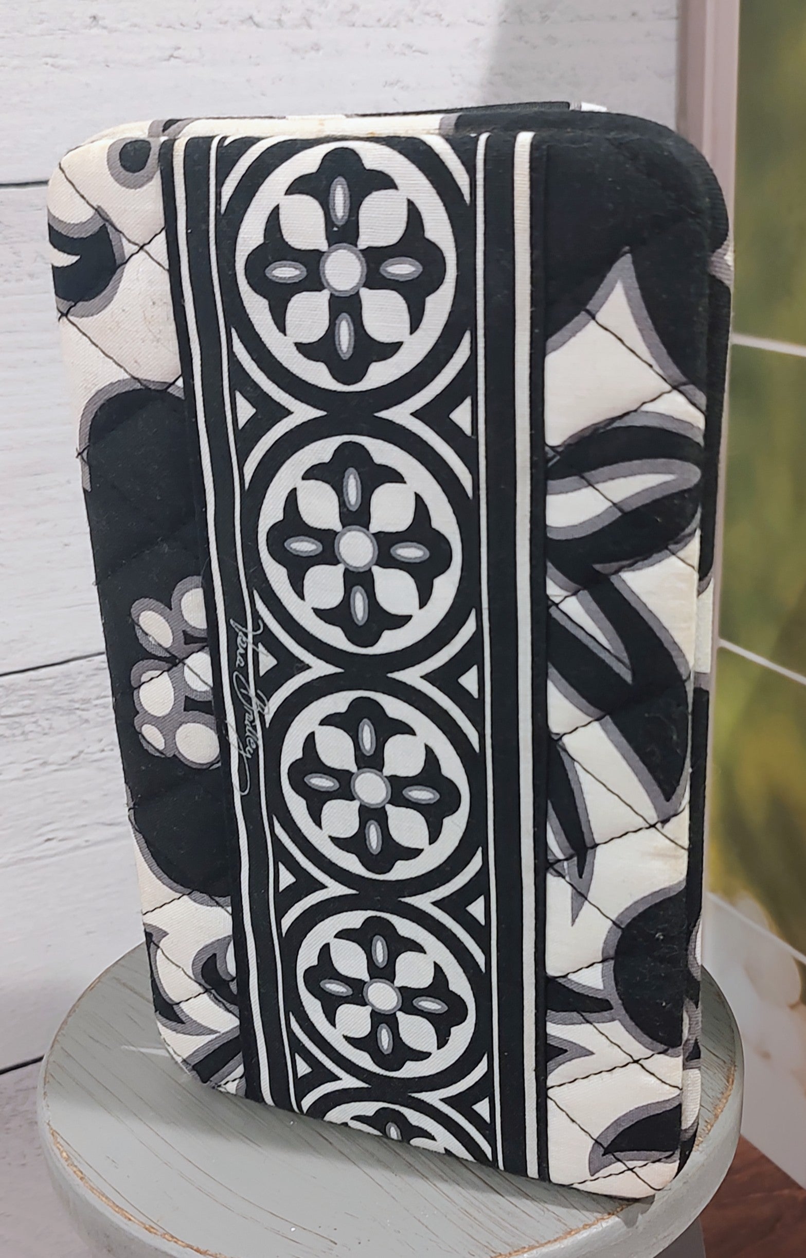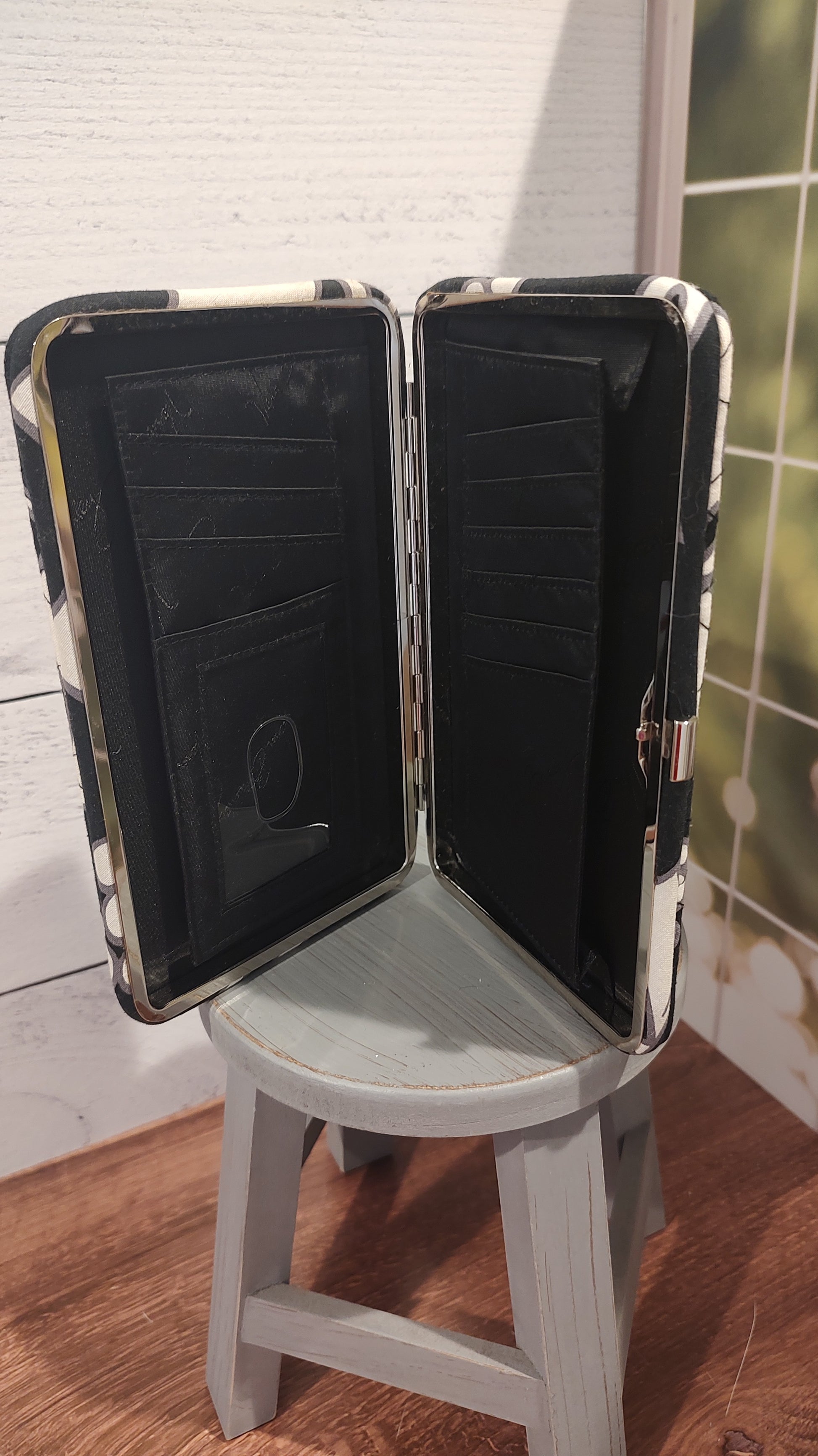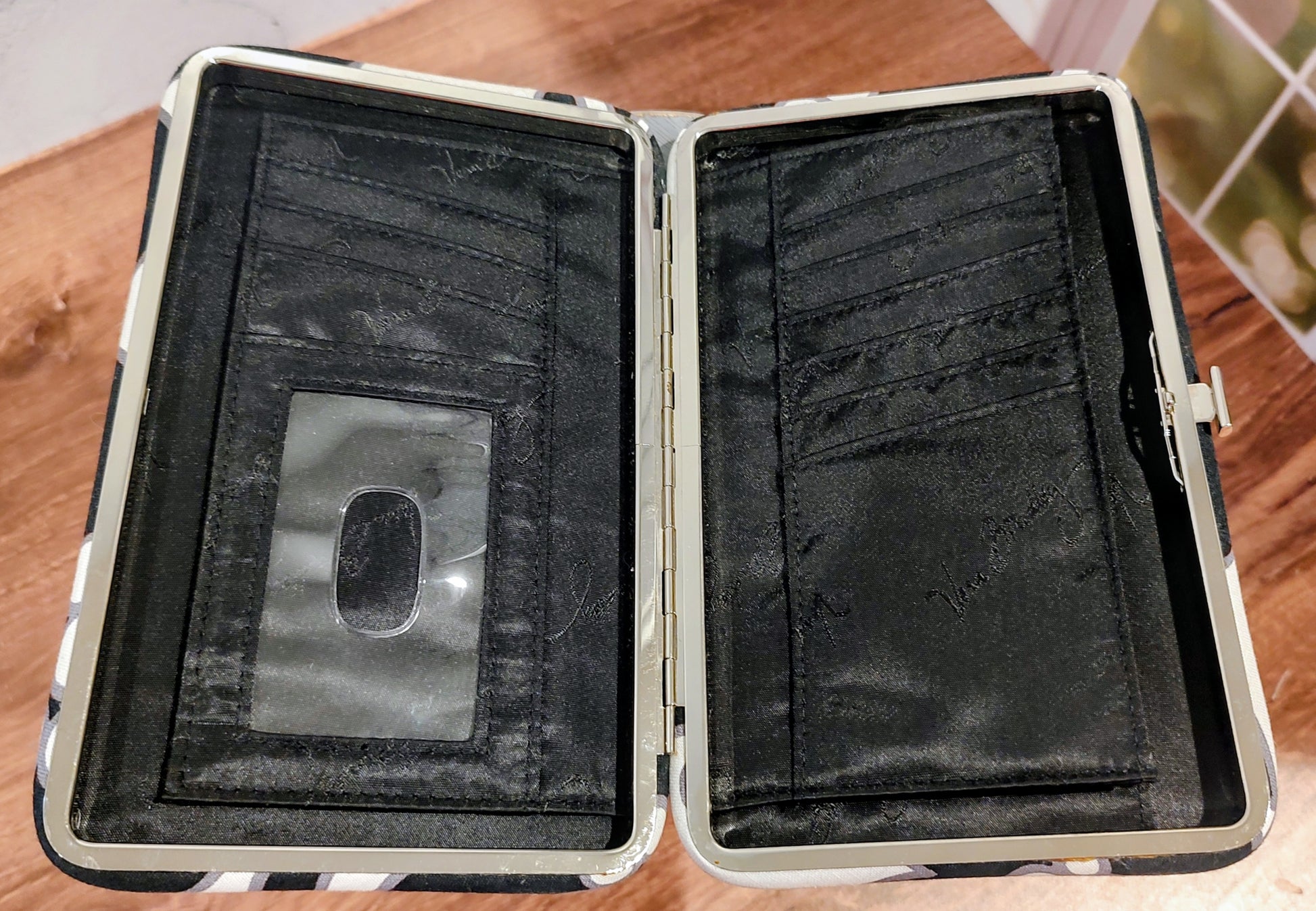 This gently used wallet in the retired black and white pattern, Night and Day, had several pockets for credit cards, cash and your ID inside a clear view pocket. There's a zipper pocket on the outside.