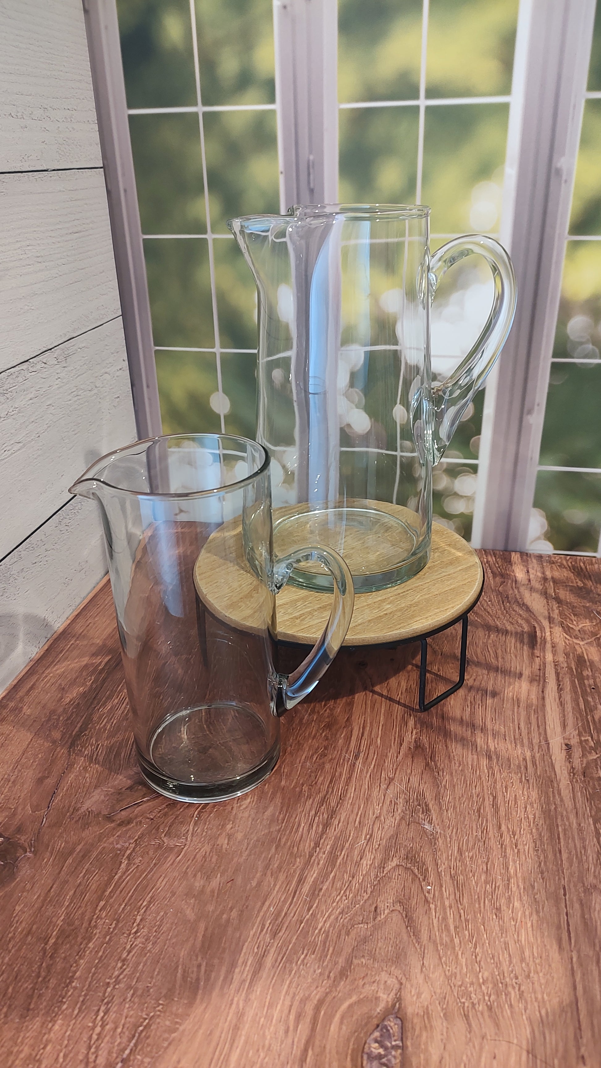 The larger one is a heavy bottom, clear glass picture wider at the bottom than the top. The base is approximately 5 1/2 " & 4 1/2" across the top (side to side, 5 1/4 at the spout). Pitcher is 10 1/4" tall.