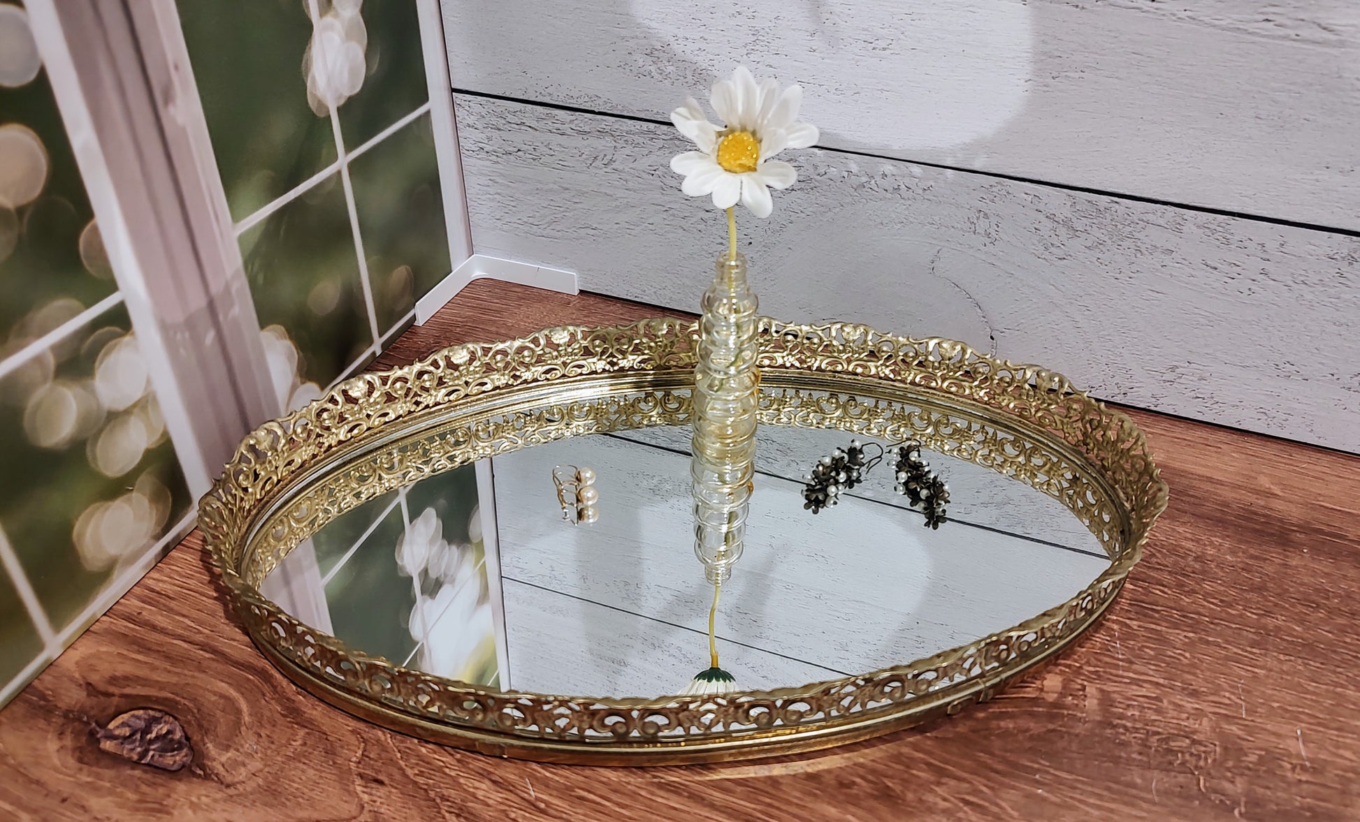 Beautiful vintage filigree gold trimmed mirrored tray. Perfect for the bedroom, bathroom, hallway or anywhere you'd like.
