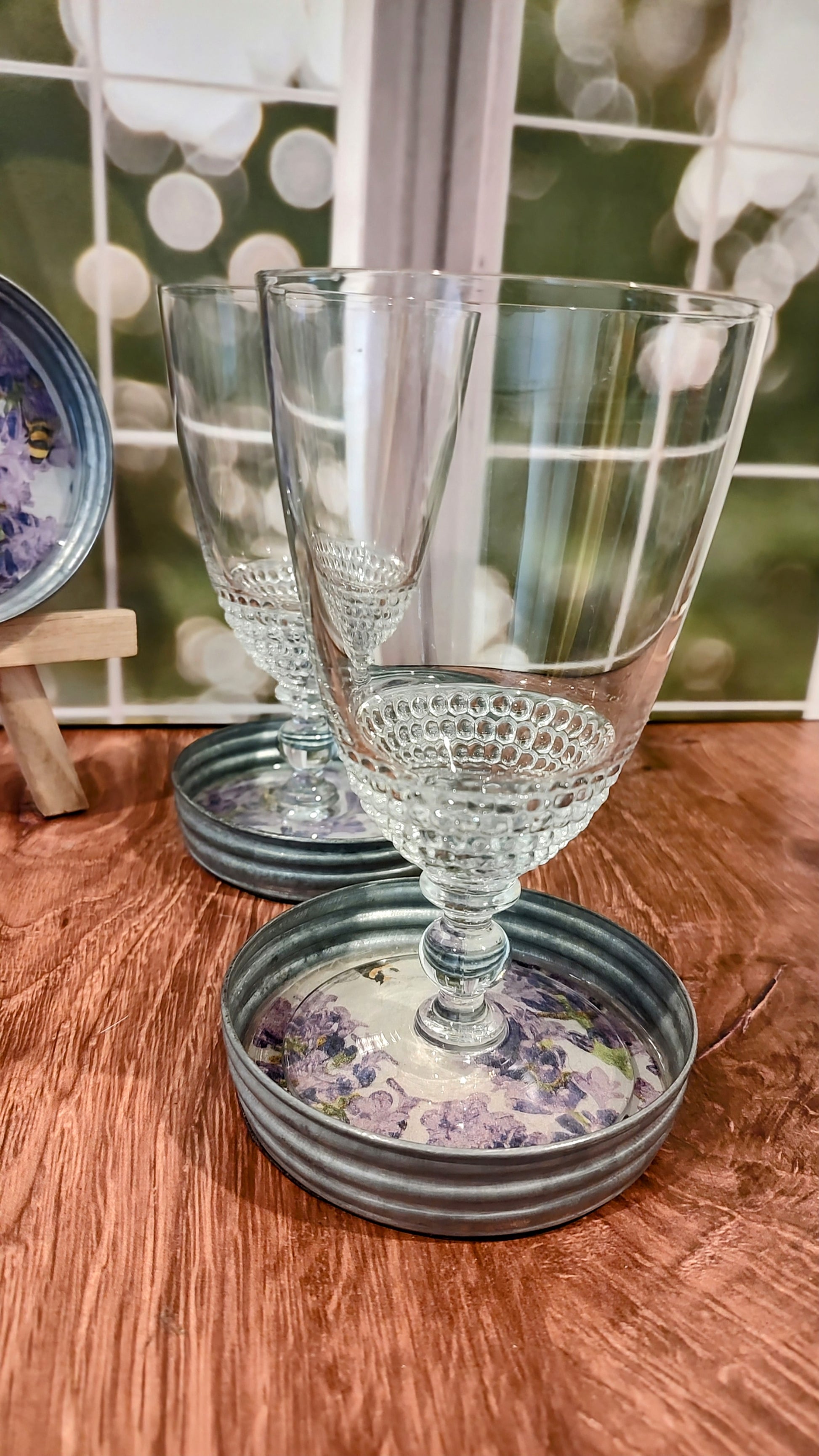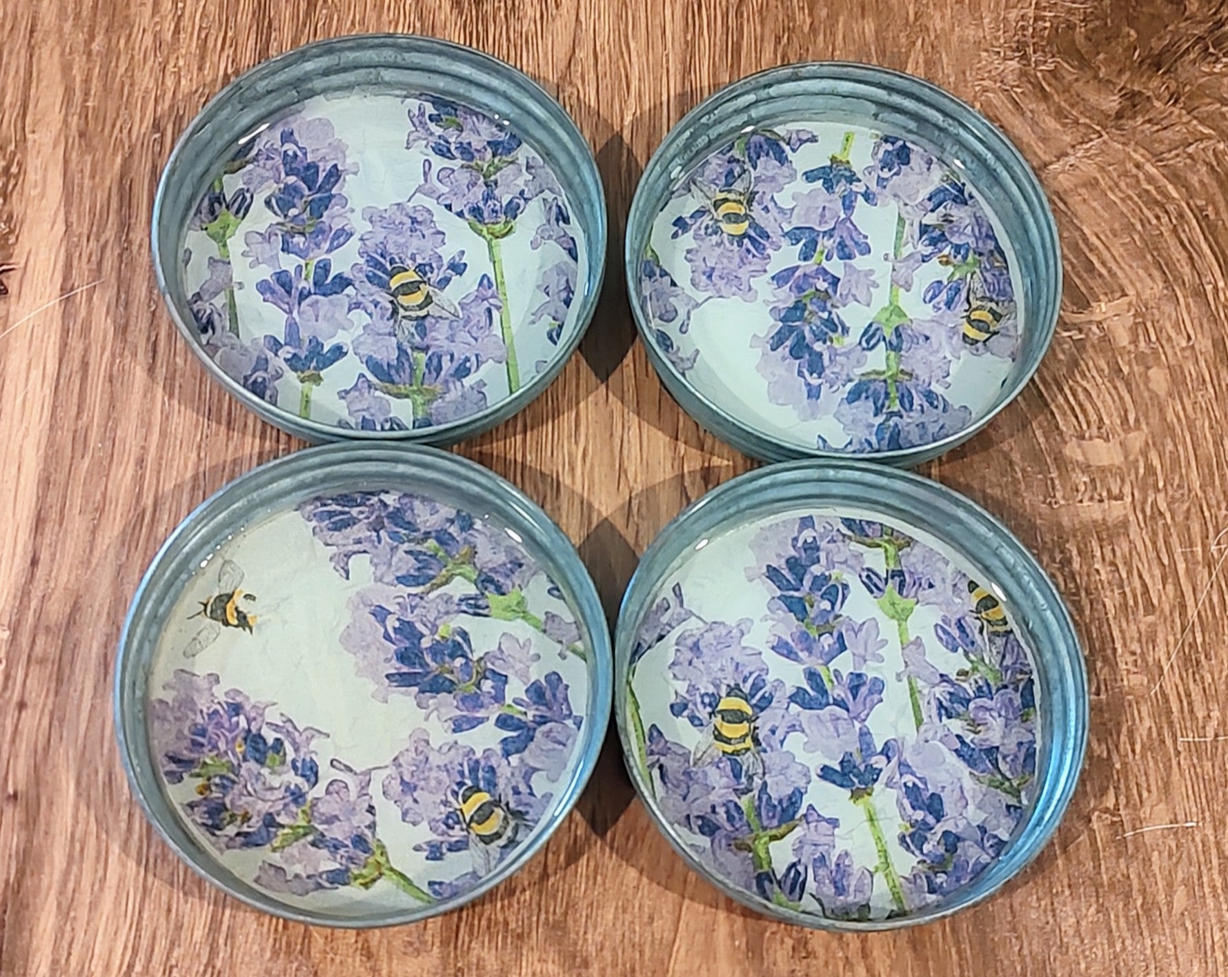 Set of four upcyled zinc lids made into coasters with decoupage paper and clear resin. The bottom is covered in velvet to avoid scratching any surface.